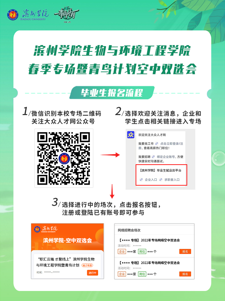 为贯彻落实党中央、国务院“稳就业”“保就业”决策部署,根据山东省人社厅和教育厅对高校毕业生就业工作的相关要求,同时为做好学校疫情防控常态化条件下校园招聘工作,学院联合大众人才网就业平台组织【“职汇云端 才聚线上”滨州学院生物与环境工程学院春季专场暨青鸟计划空中双选会】系列活动,为用人单位招聘和学院应、往届毕业生稳定就业拓路护航,诚挚邀请您参会。