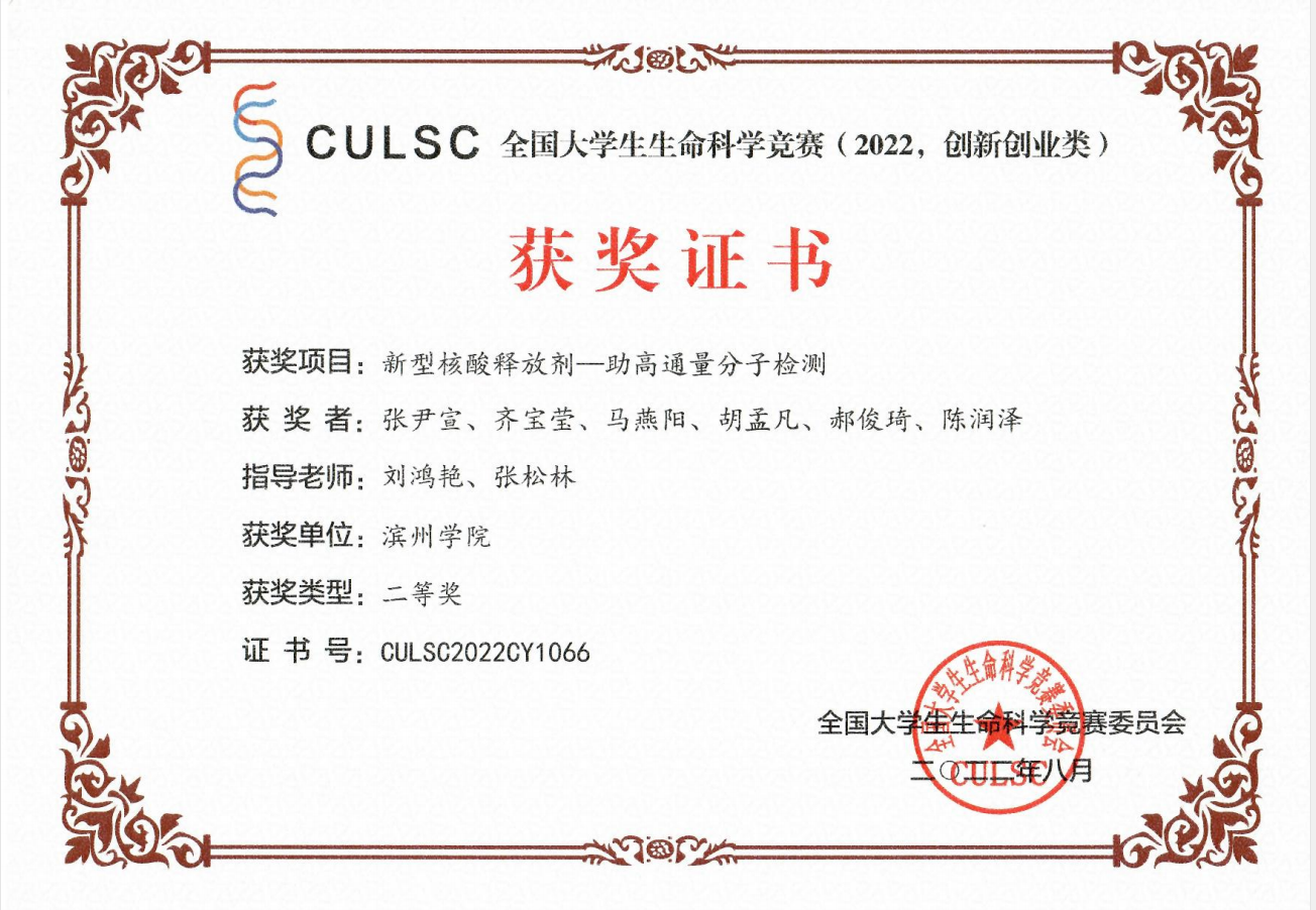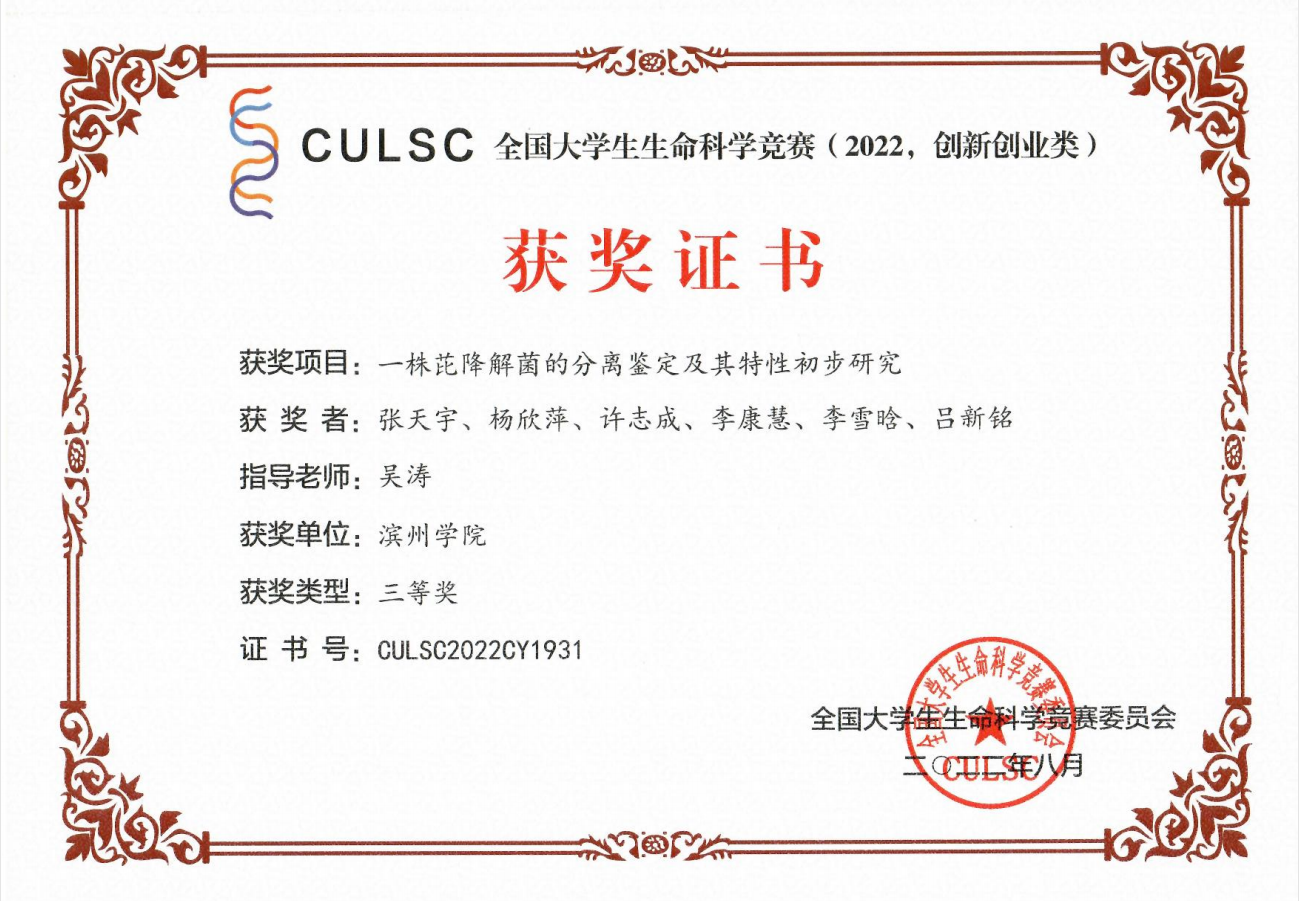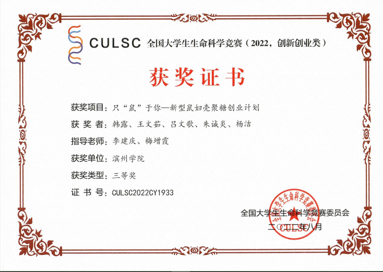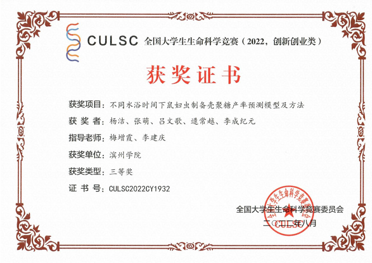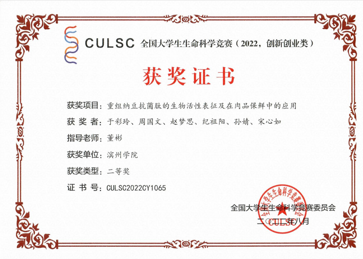 本届大赛共计收到参赛作品 5053 项,资格审查通过并进入网评4401项,经初赛网评和复赛网评,入围公开决赛项目555 项。最终,我院董彬副教授指导,于彩玲、周国文、赵梦思、纪祖阳、孙婧、宋心如完成的研究项目《重组纳豆抗菌肽的生物活性表征及在肉品保鲜中的应用》荣获创新类国家级二等奖,刘鸿艳副教授指导,张尹宣、齐宝莹、马燕阳、胡孟凡、郝俊琦、陈润泽完成的创意项目《新型核酸释放剂—助高通量分子检测》荣获创业类(创意类)国家级二等奖,吴涛教授指导,张天宇、杨欣萍、许志成、李康慧、李雪晗、吕新铭完成的研究项目《一株芘降解菌的分离鉴定及其特性初步研究》荣获创新类国家级三等奖,梅增霞副教授指导,杨洁、张萌、吕文歌、逯常越、李成纪元完成的科研项目《不同水浴时间下鼠妇虫制备壳聚糖产率预测模型及方法》荣获创新类国家级三等奖,李建庆教授指导,韩露、王文茹、吕文歌、朱诚炎、杨洁完成的创业项目《只“鼠”于你—新型鼠妇壳聚糖创业计划》荣获创业类(实践类)国家级三等奖。