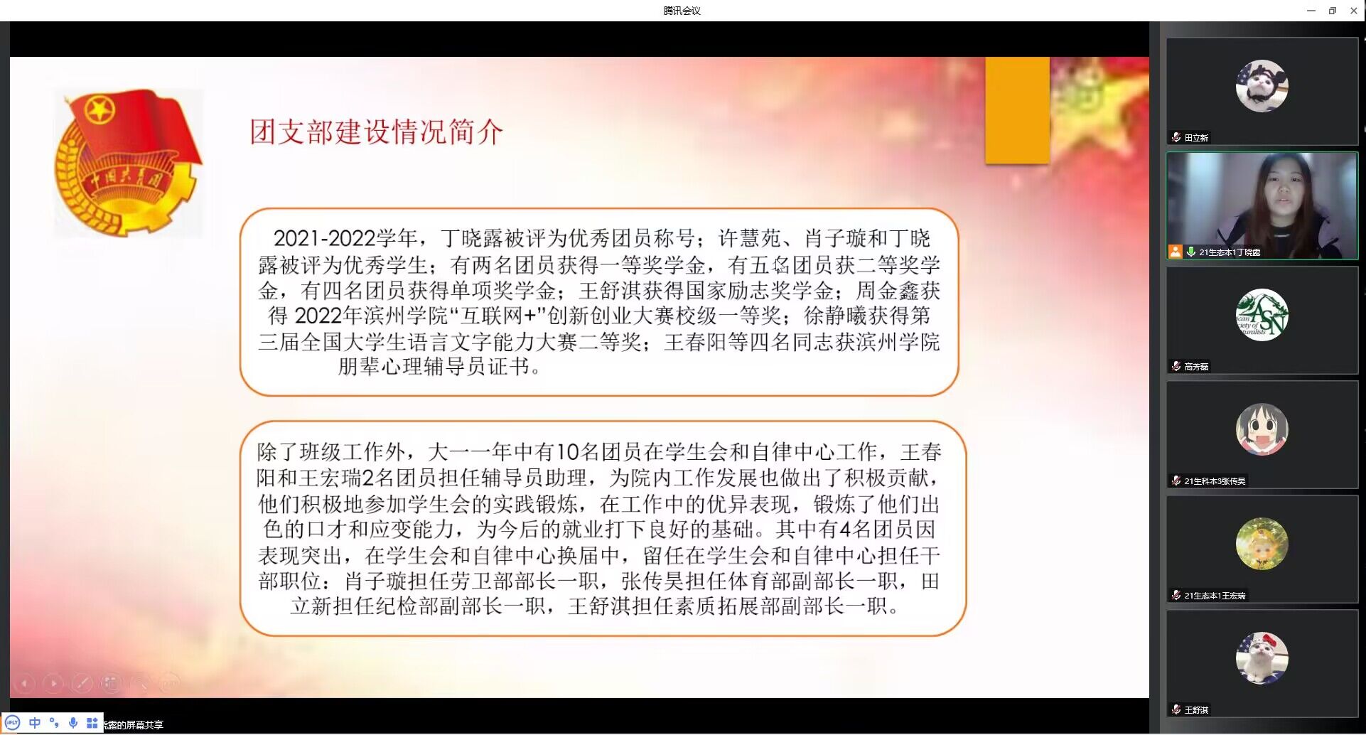 会议开始前,团支书下达通知,让所有成员入会,进行会前学习。会议开始,由团支书带领全体团支部成员奏唱团歌。接下来团支部书记丁晓露汇报了团支工作,对团支部基本情况、团支部建设情况、定期开展三会两制一课的情况进行了分享交流。之后团支部委员和团员依次进行发言,进行“学习贯彻党的二十大精神”的心得体会交流,分析思想道德和学习工作方面的不足和努力方向。班主任就本次团日活动作出点评讲话,指出改进的方向。会议最后,全体同学重温入团誓词,会议圆满结束。