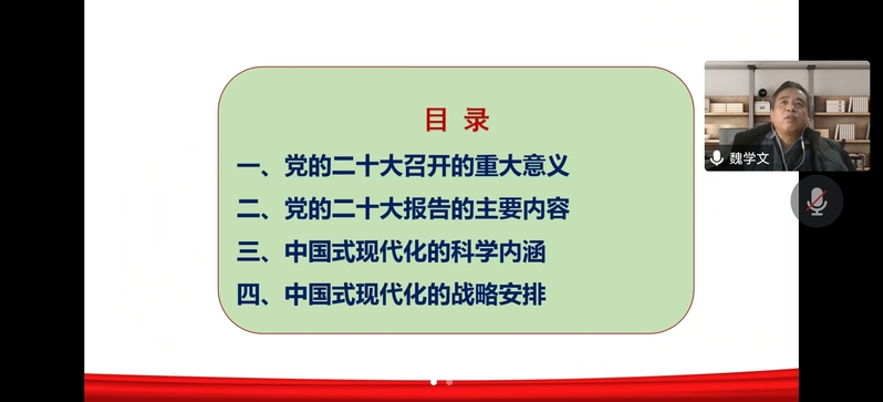 魏学文教授围绕深刻认识党的二十大召开的重大意义,党的二十大报告的主要内容,中国式现代化的科学内涵,中国式现代化的战略安排等四个方面,全面深入地为学院师生讲解了党的二十大主题和主要成果、过去5年的工作和新时代10年的伟大变革,清晰透彻地解读了党的二十大报告确立的重大论断和战略思想。魏教授的报告站位高远、视野开阔、分析透彻、内容丰富、深入浅出,结合具体案例,引用了大量详实的数据,突出三件大事、十六个方面伟大成就、四个里程碑意义和中国式现代化的科学内涵、本质要求和五大原则等重要内容,对党的二十大精神作了系统宣讲和深入阐释,具有很强的政治性、理论性、实践性和指导性,是认真学习宣传党的二十大精神的重要引导。