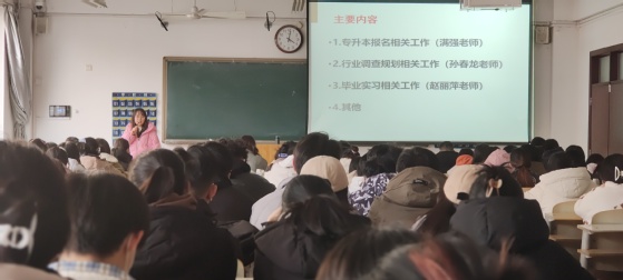 会议开始,史戈首先介绍了本次会议的主要内容。随后,辅导员满强讲解了专升本报名相关工作及注意事项,让学生们更深刻了解专升本的重要性。接着,孙春龙为大家讲述了行业调查规划相关工作,解读了考试政策,分析今年的考试形势,就专升本考试前期准备工作做全面总结,重点解读了英语等关键科目的考情与生情。最后赵丽萍为同学们分析了毕业实习相关工作并送上了院长寄语,鼓励同学们无论是就业或是备考都要提前做好两手准备,以最好的状态去迎接未来。同学们认真聆听,此次会议圆满结束。