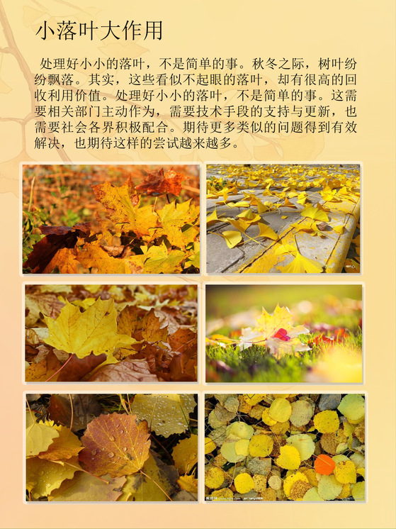 “湿地的保护及其意义”系列作品,从湿地的形成、作用、分布、等方面,采取图文并茂的方式,生动形象介绍了保护湿地的重要性,也介绍了国家保护湿地的政策措施和成功案例。“落叶的生态与环保意义”系列作品,则从落叶的原理和种类入手,介绍其处理方法和利用价值,向观者传递生态环保的理念,只要我们合理利用资源,就能变废为宝,最大程度利用落叶资源,创造更多价值。