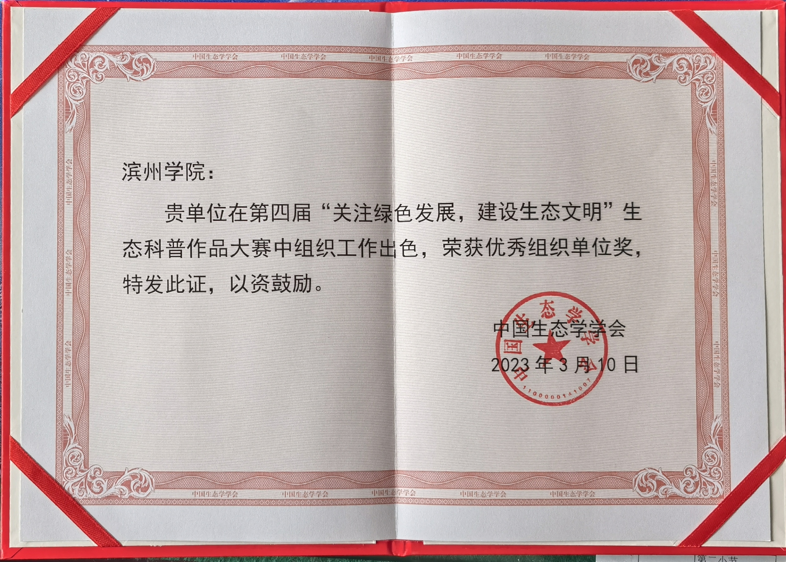2023年2月17日,由中国生态学学会主办的第四届“关注绿色发展,建设生态文明”生态科普作品大赛评选结果揭晓。滨州学院被评为优秀组织单位,我院“湿地的保护及其意义”和“落叶的生态与环保意义”两件作品均荣获图文类三等奖。