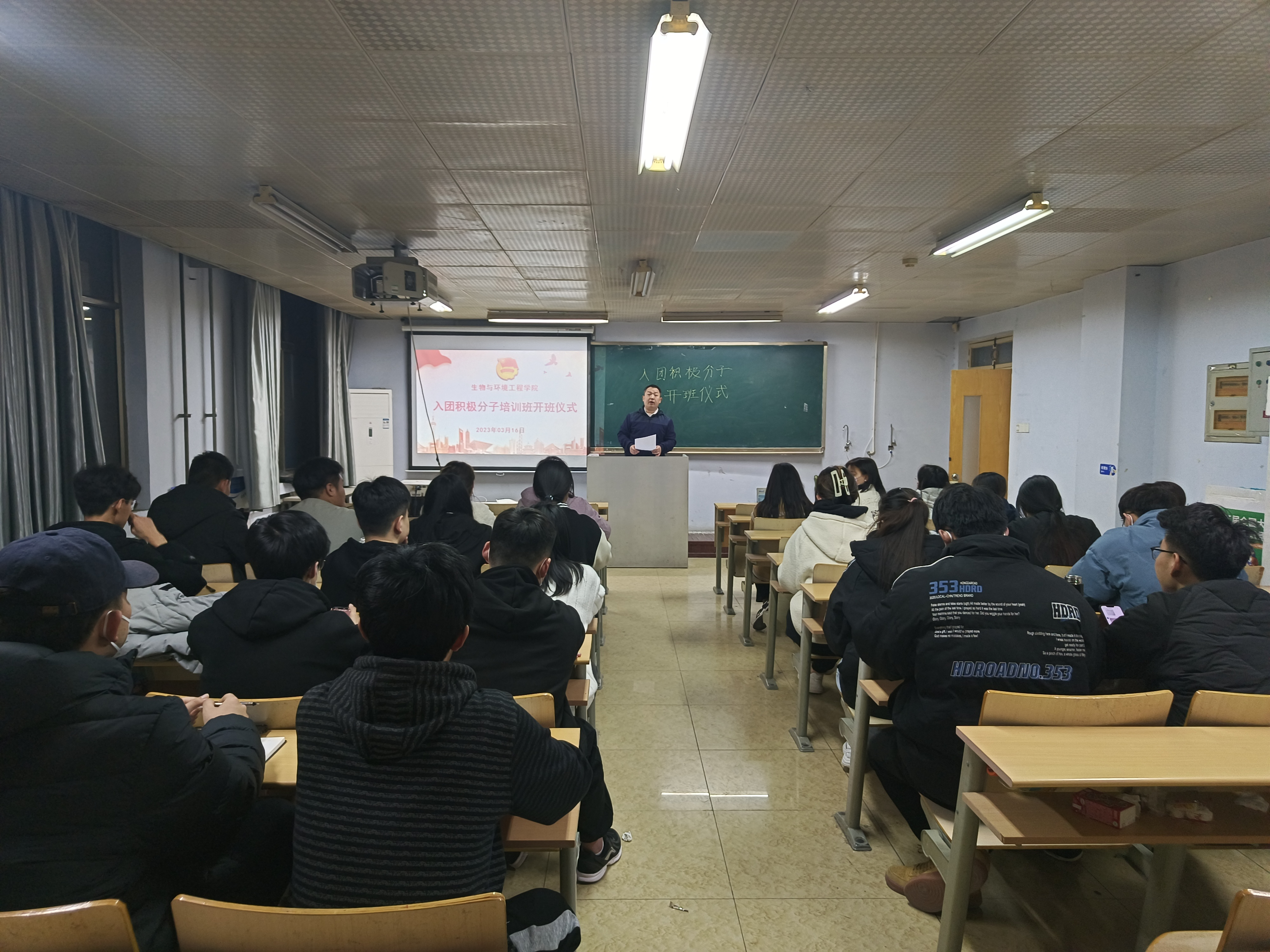 发展团员是团的建设基础工程,为进一步加强共青团组织队伍建设,增强共青团员的组织荣誉感,凝聚团组织活力,生物与环境工程学院于2023年3月16号晚7点在实验中心B7-311组织入团积极分子培训开班仪式并进行第一次团课培训,此次开班仪式由团总支书记赵望锋主持。