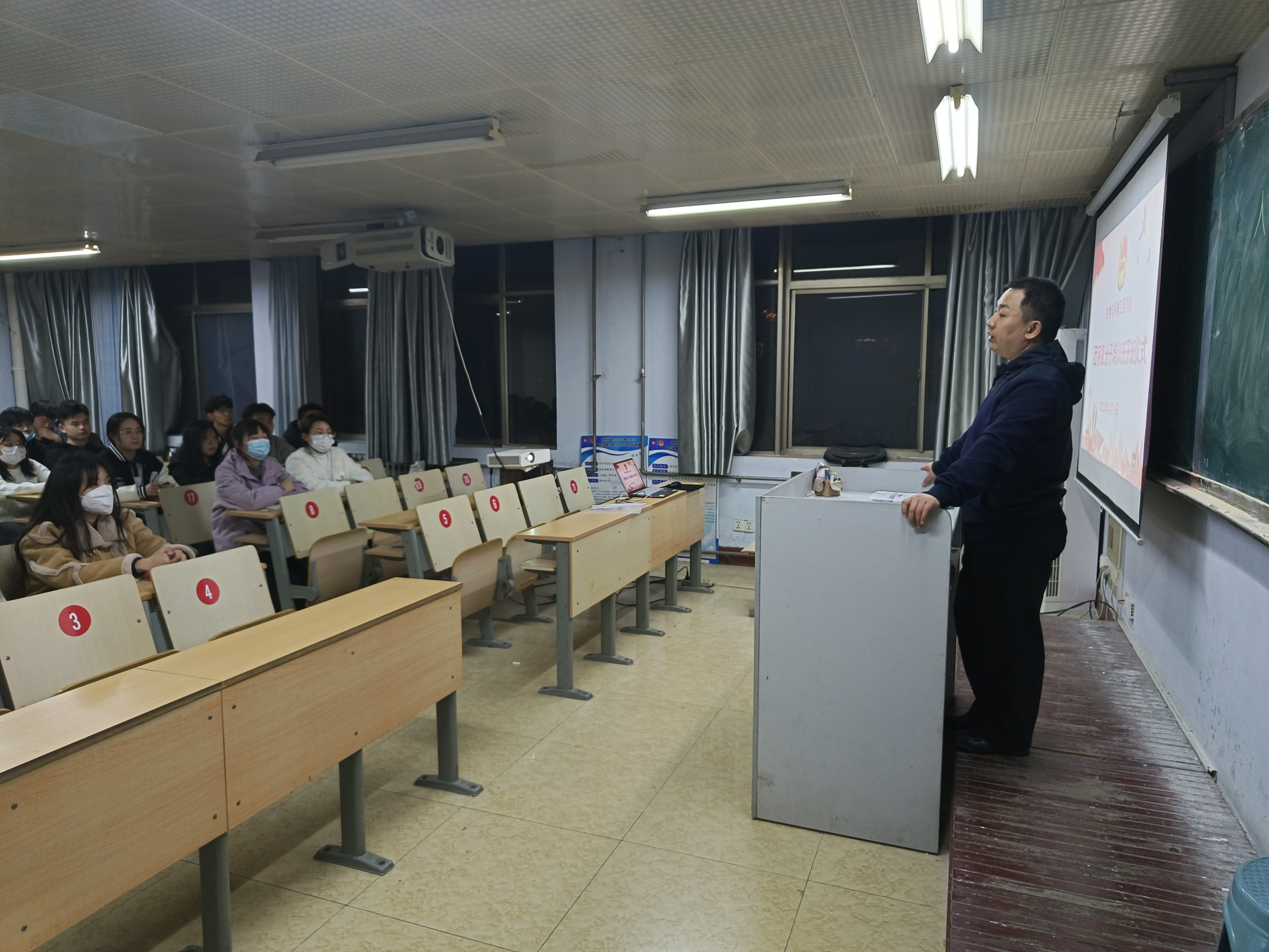 首先,赵望锋为入团积极分子们做动员讲话,介绍培训班课程安排、课堂纪律要求、课堂检验成果方式。随后,赵望锋讲解团的组织制度,团的干部,团的纪律等团务知识,科普关于团旗、团徽、团歌的知识。最后,赵望锋向各位学员提出要求,希望大家争做有信仰、重品行、守纪律的时代新人。
