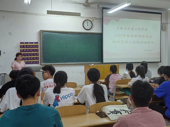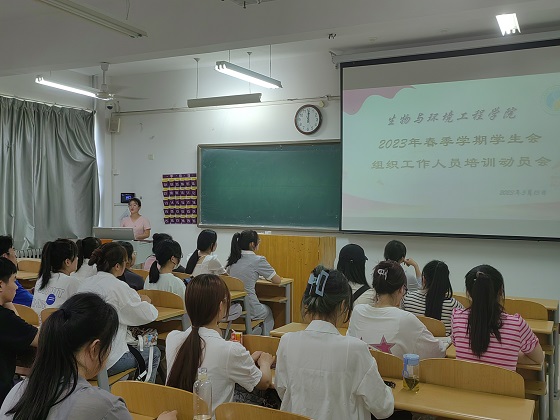 为加强学生会工作队伍的凝聚力、战斗力,使学生会组织工作人员明确职责,树立“全心全意”为同学们服务的意识,营造风清气正的学生组织氛围。5月15日,生物与环境工程学院在8号教学楼203教室组织开展2023年春季学期学生会组织工作人员培训动员会。