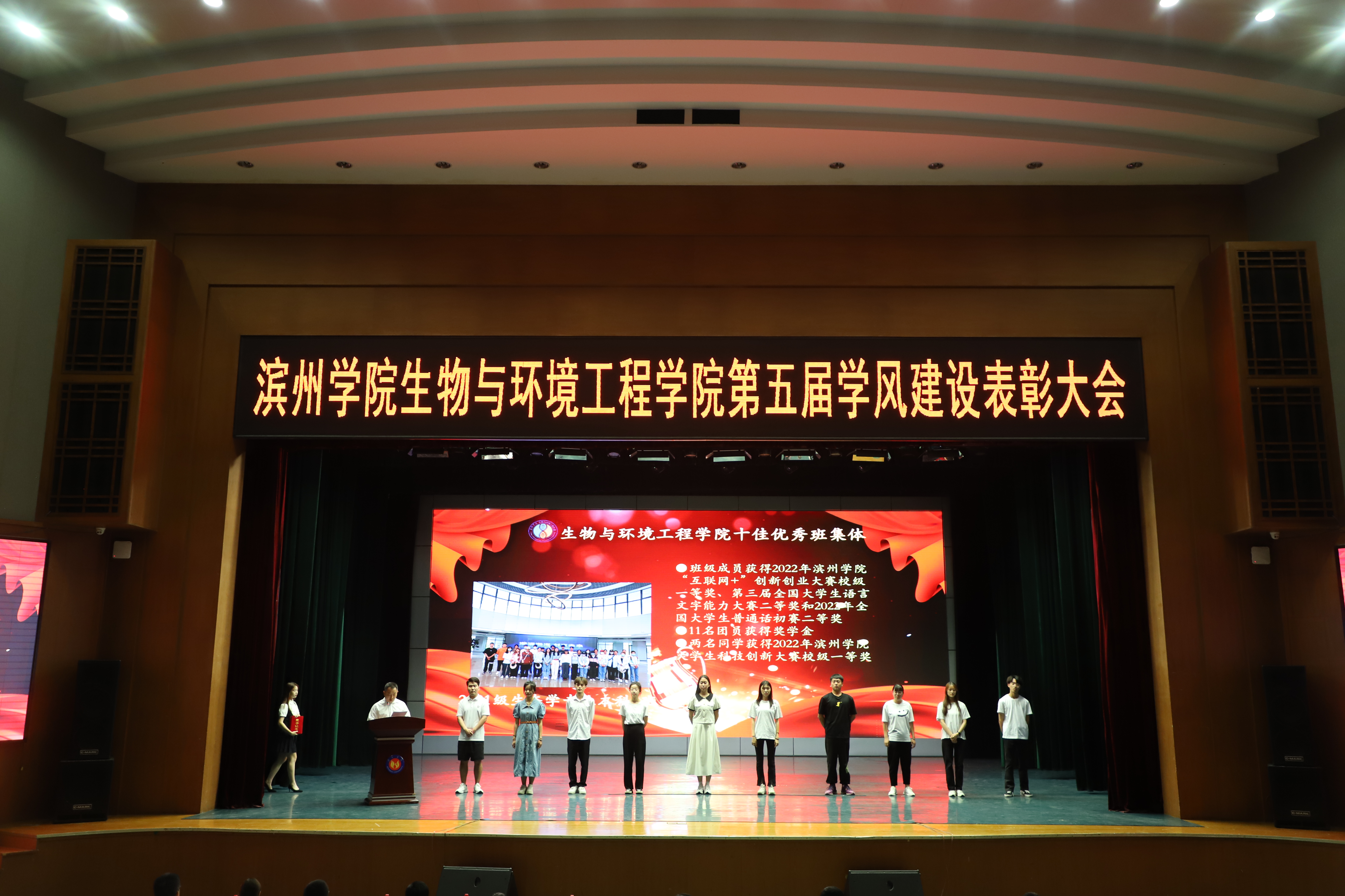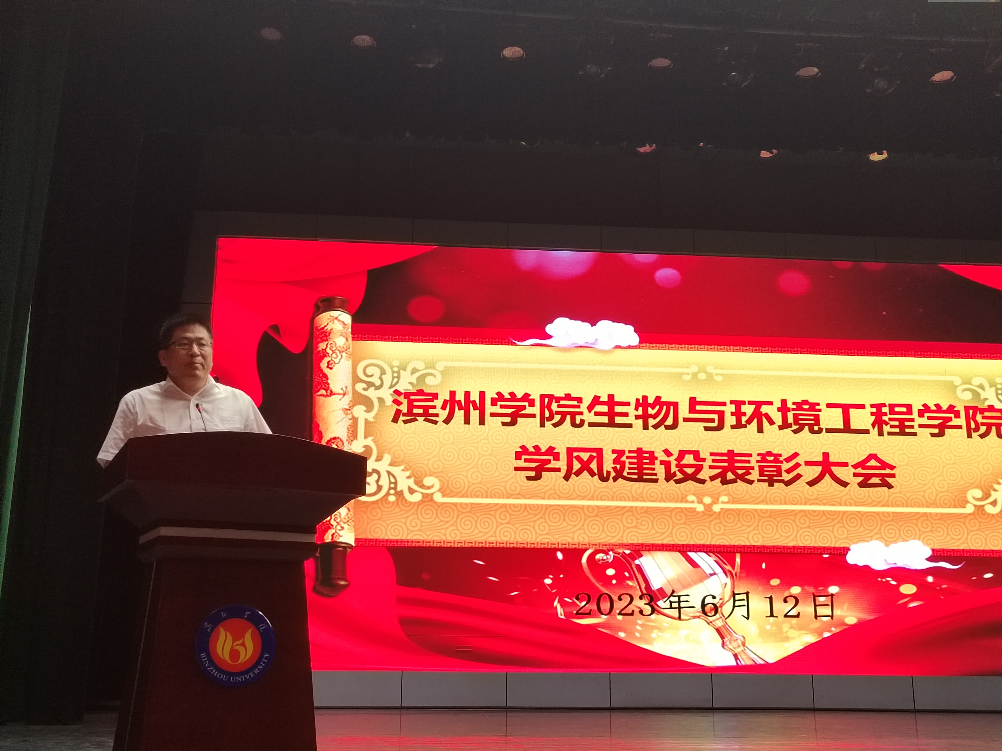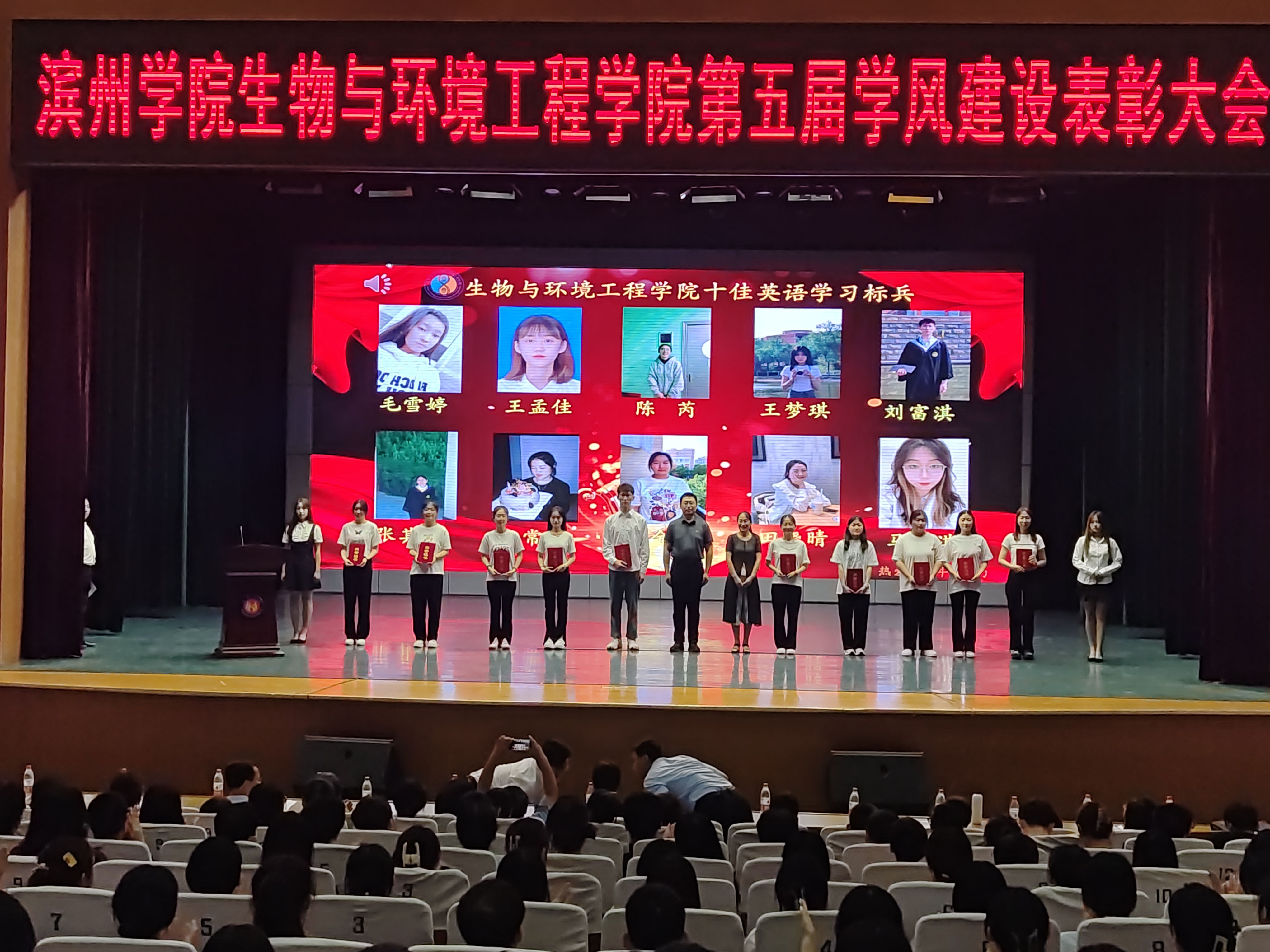学风即学校的学习风气。从广义上讲就是学校师生员工在治学精神、治学态度和治学方法等方面的风格,也是学校全体师生知、情、意、行在学习问题上的综合表现,学风对学生的成长起着重大的作用,对学校的发展和建设产生深远的影响。大会开始,赵望锋首先上台对在座的老师,同学们表示热烈欢迎。之后,副院长吴涛宣读《滨州学院生物与环境工程学院关于表彰2022-2023学年学风建设先进集体、先进个人的决定》。接着,赵望锋主持颁奖典礼,并与获得“十佳英语学习标兵”“十佳学习标兵”“十佳学生干部”,“十佳优良学风宿舍”“十佳学风模范班集体”代表学生合影留念。最后,左之涛对获奖同学表示祝福以及为本次学风表彰大会进行总结。