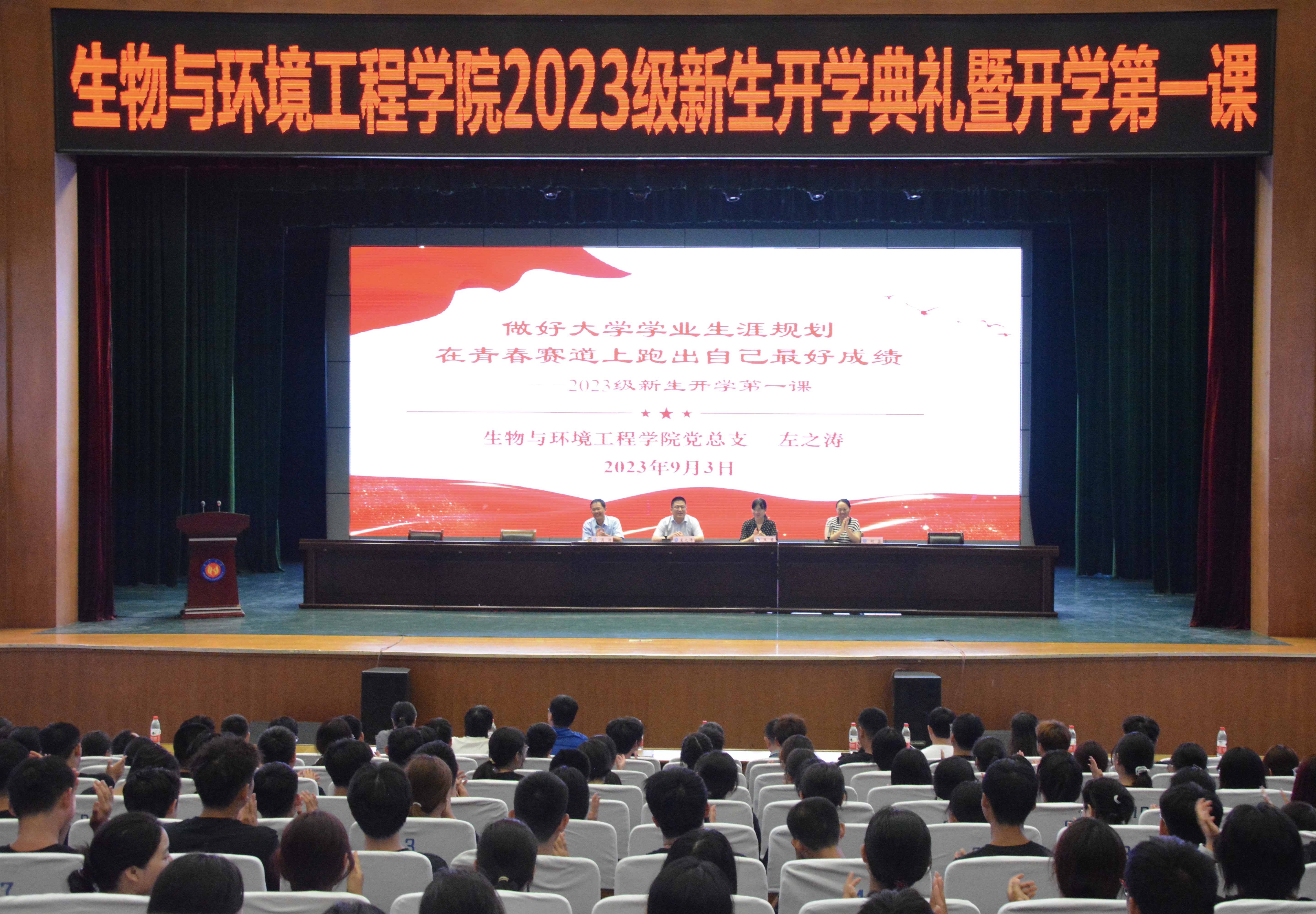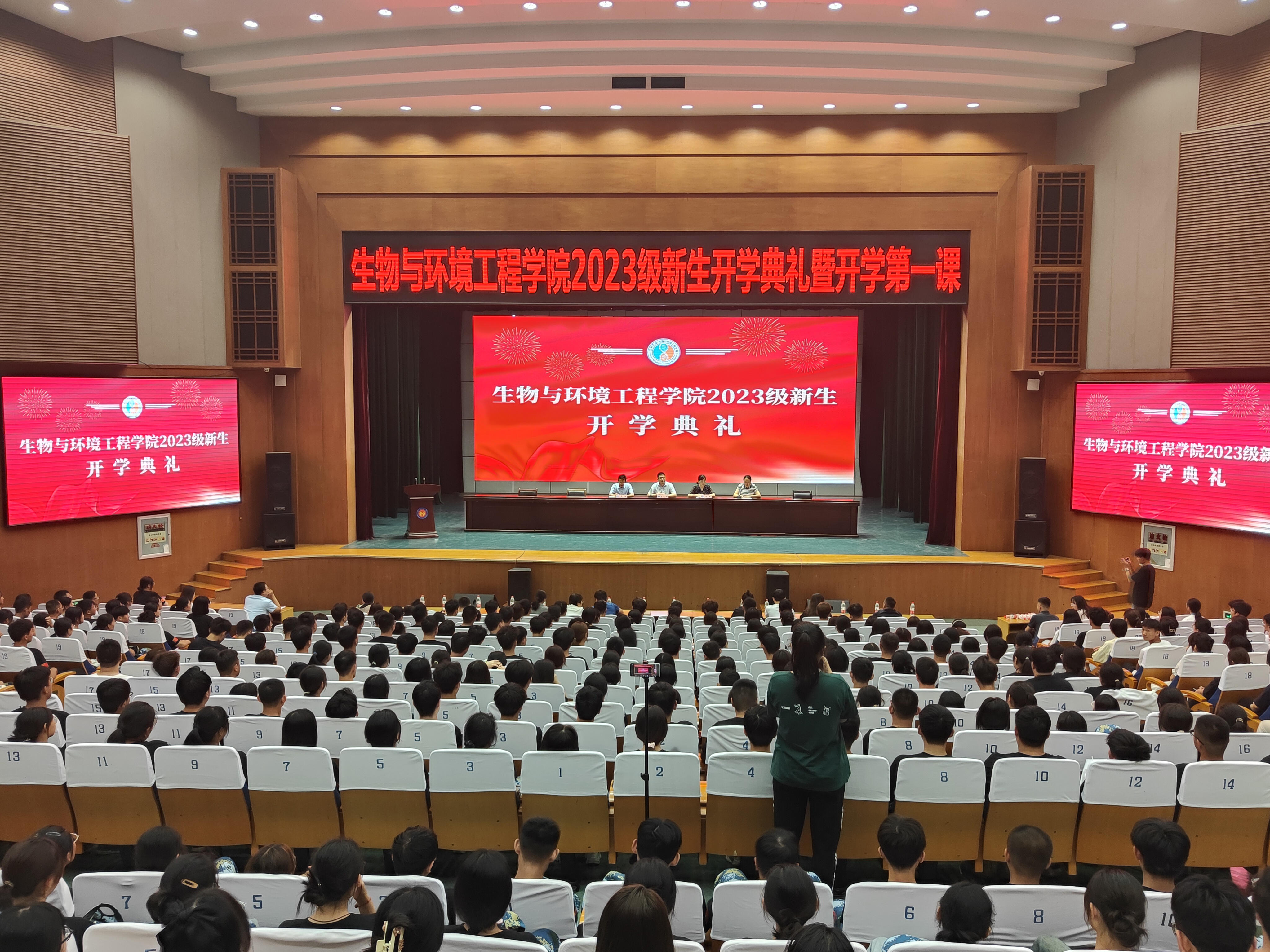 9月3日,生物与环境工程学院2023级新生开学典礼暨开学第一课在学苑会堂举行,学院党总支书记左之涛、院长王君、副院长吴涛等学院领导和全体辅导员、2023级新生班主任以及2023级全体新生参加活动。左之涛为全体新生讲授开学第一课,典礼由党总支副书记时芸主持。