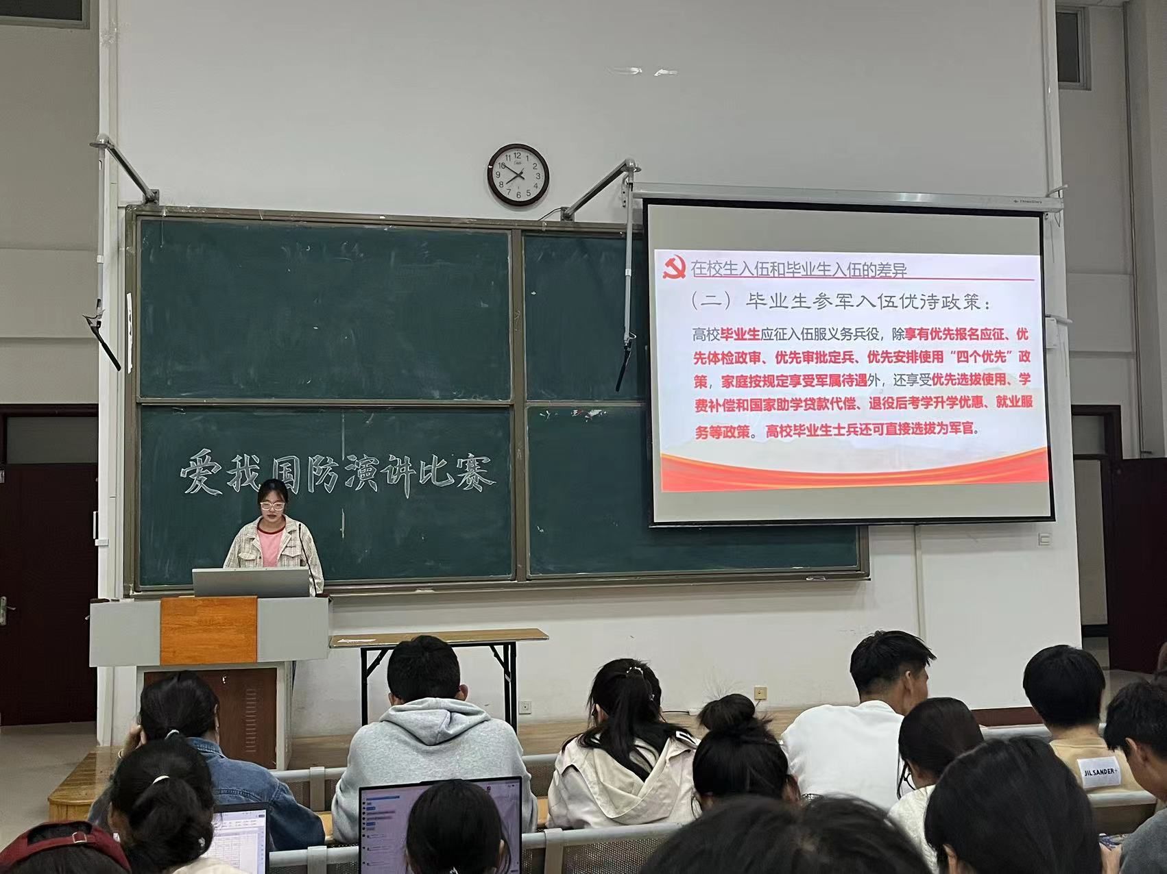 为加强征兵政策宣传,进一步增强同学们的爱国热情和参军意愿,普及国防知识、强化国防教育,鼓励同学们积极应征入伍、献身国防事业,生物与环境工程学院于10月31日在八教305召开了征兵入伍宣讲会。本次征兵入伍宣讲由兵役服务部部长梁凯璇主持,23级学生参加。