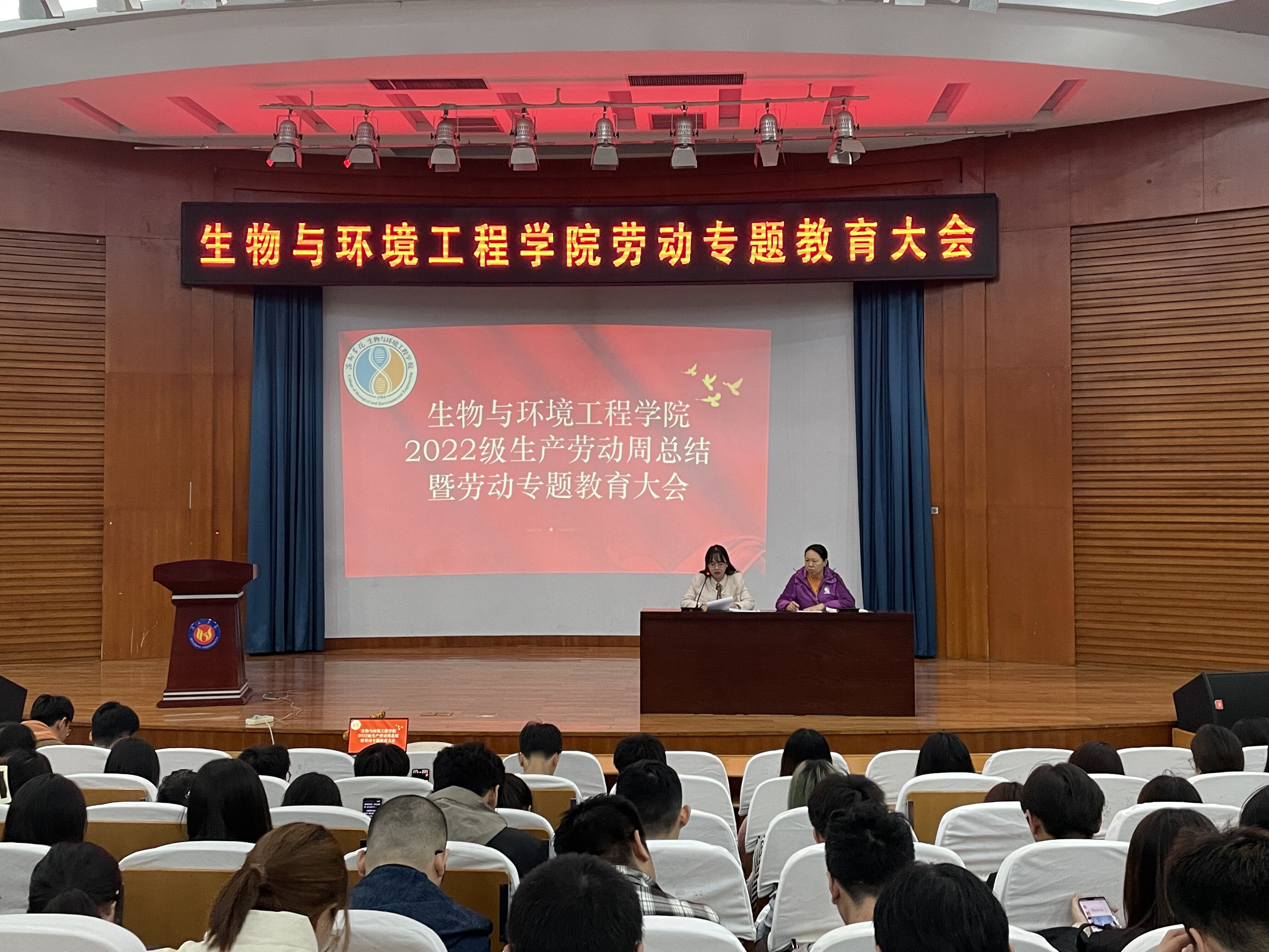 为深入学习宣传贯彻习近平总书记在党的二十大报告中强调的“在全社会弘扬劳动精神”,进一步教育引导学生崇尚劳动、尊重劳动,树立正确劳动观,培育和践行社会主义核心价值观,弘扬劳动精神,提升新时代大学生的综合素质,促进学生全面发展、健康成长。生物与环境工程学院于11月5日晚6:30在明德报告厅召开了2022级劳动专题教育大会。此次会议由党总支副书记时芸、辅导员史戈主持,2022级普本全体同学参加。