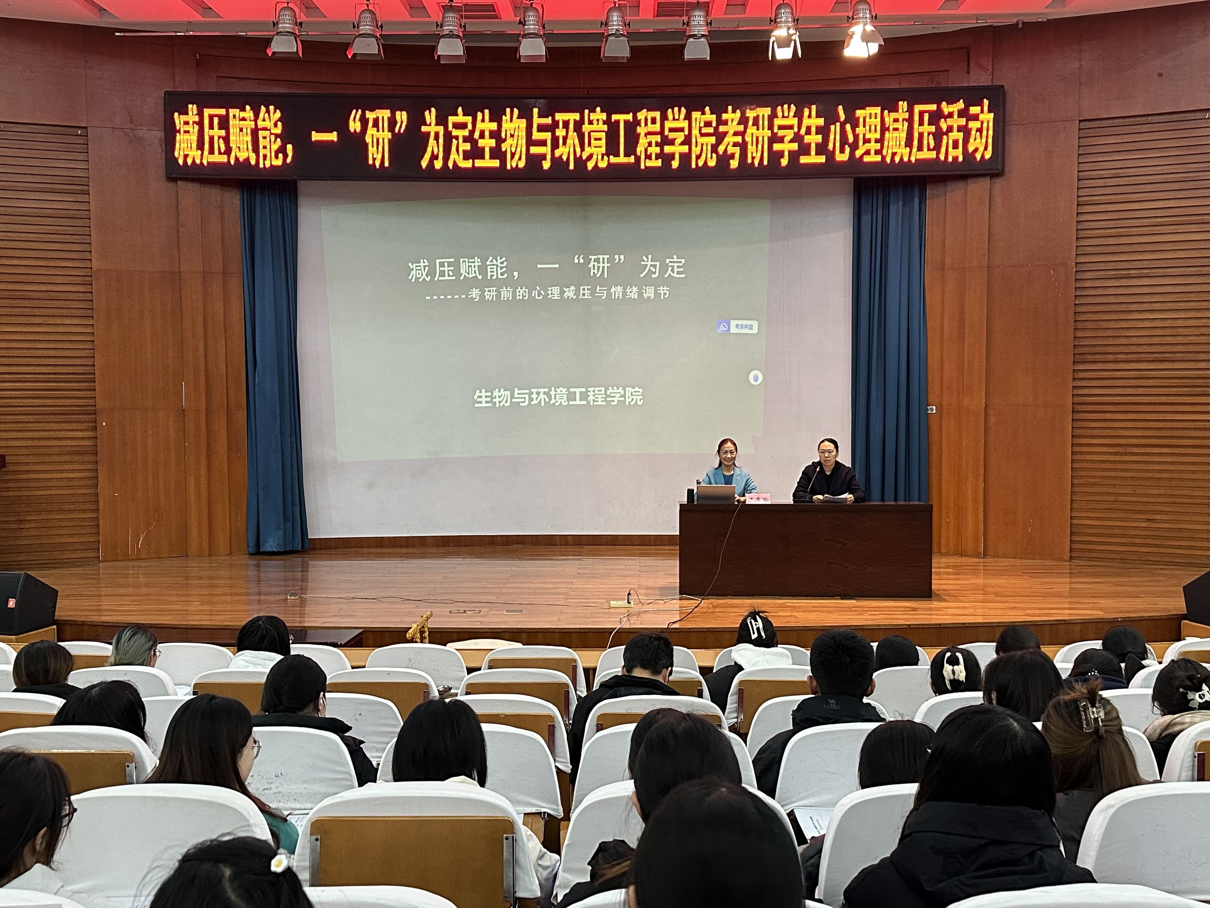 2024年硕士研究生考试时间临近,为帮助考研学生缓解备考焦虑,掌握科学减压方法,11月9日,生物与环境工程学院在明德报告厅举办减压赋能,一“研”为定考研学生心理减压活动。此次活动特邀教师教育学院陈秀珍教授做报告,党总支书记左之涛,党总支副书记时芸,教务科科长赵丽萍、辅导员、班主任,和2020级全体考研学生参加。