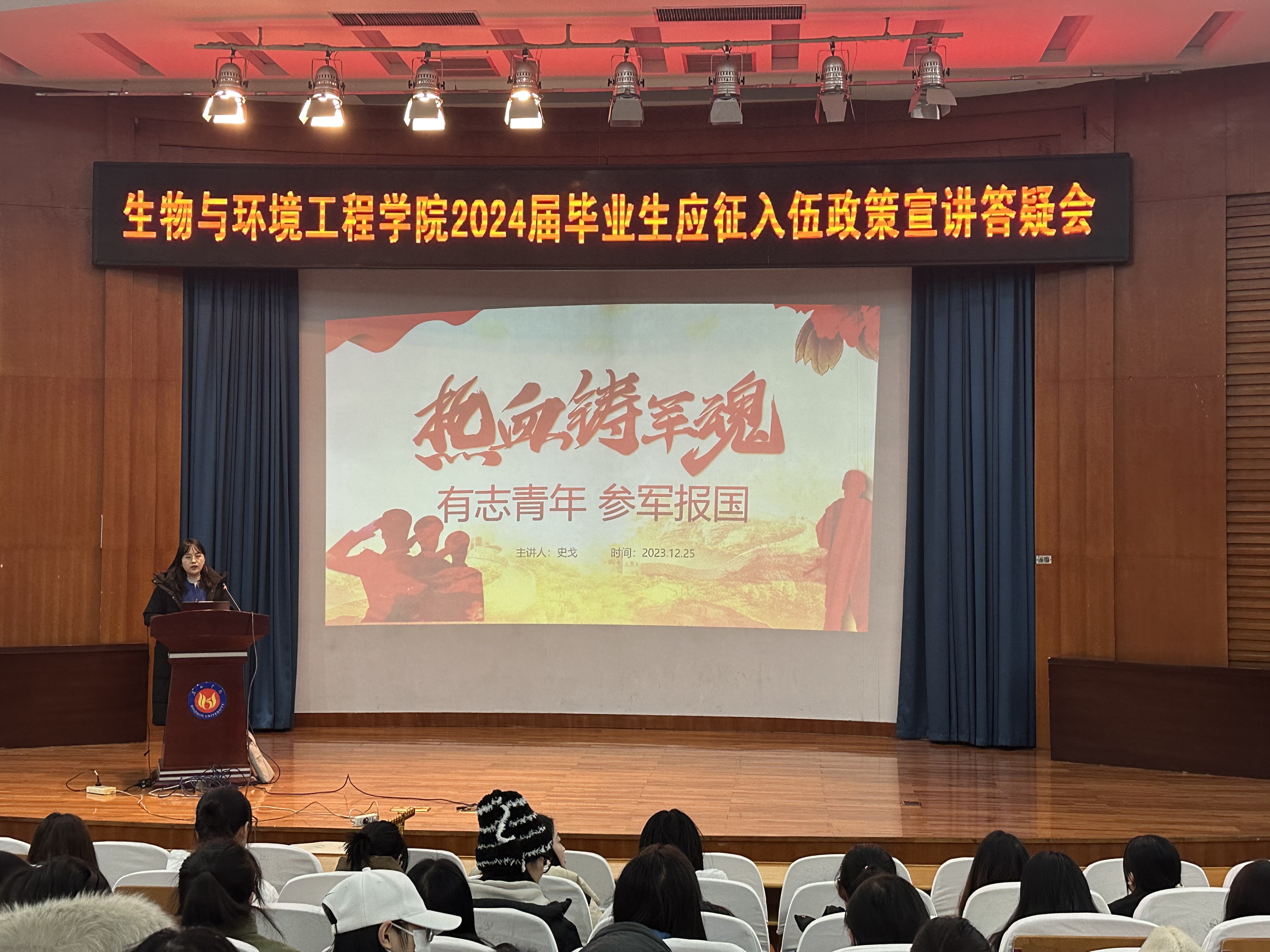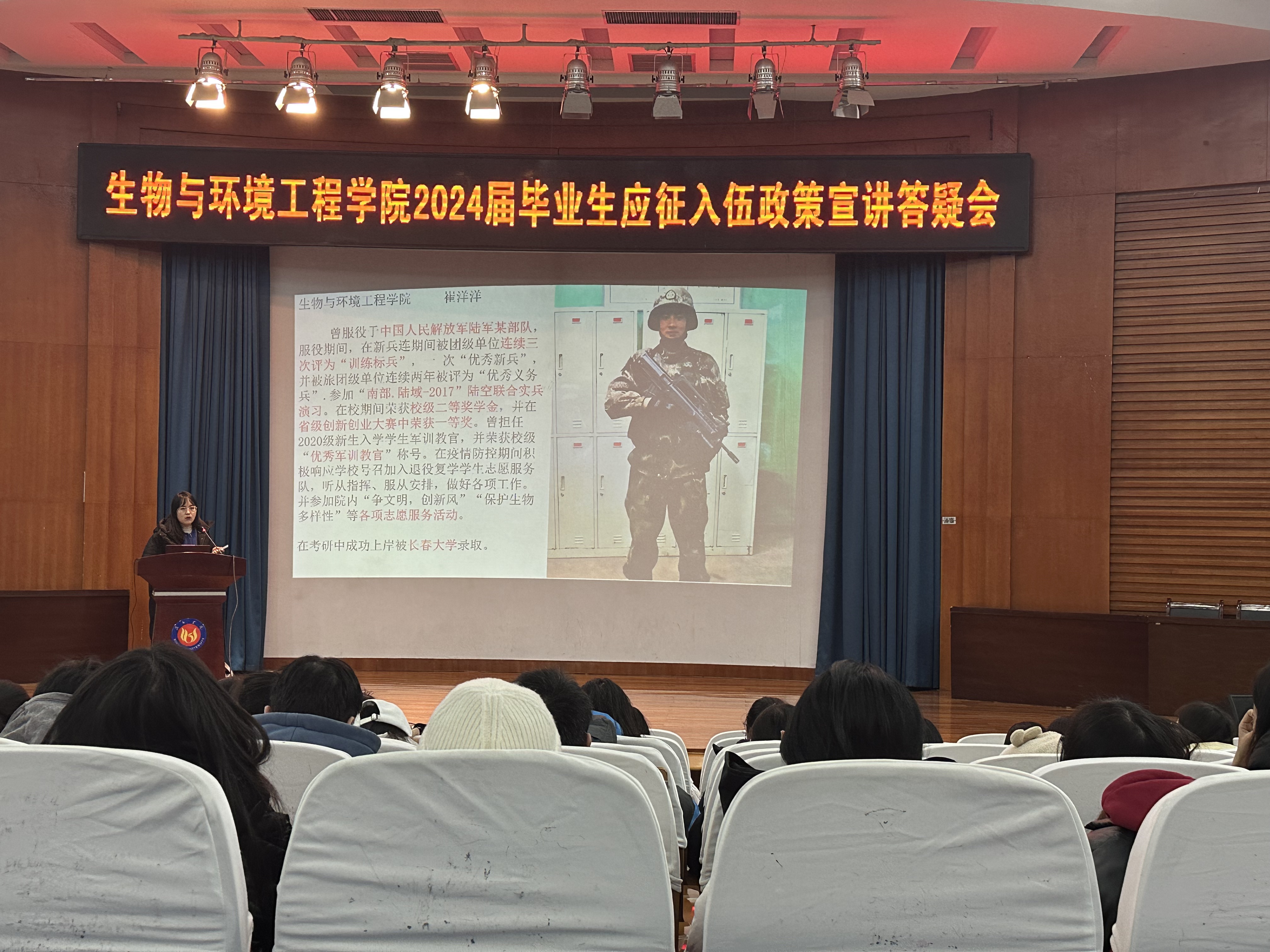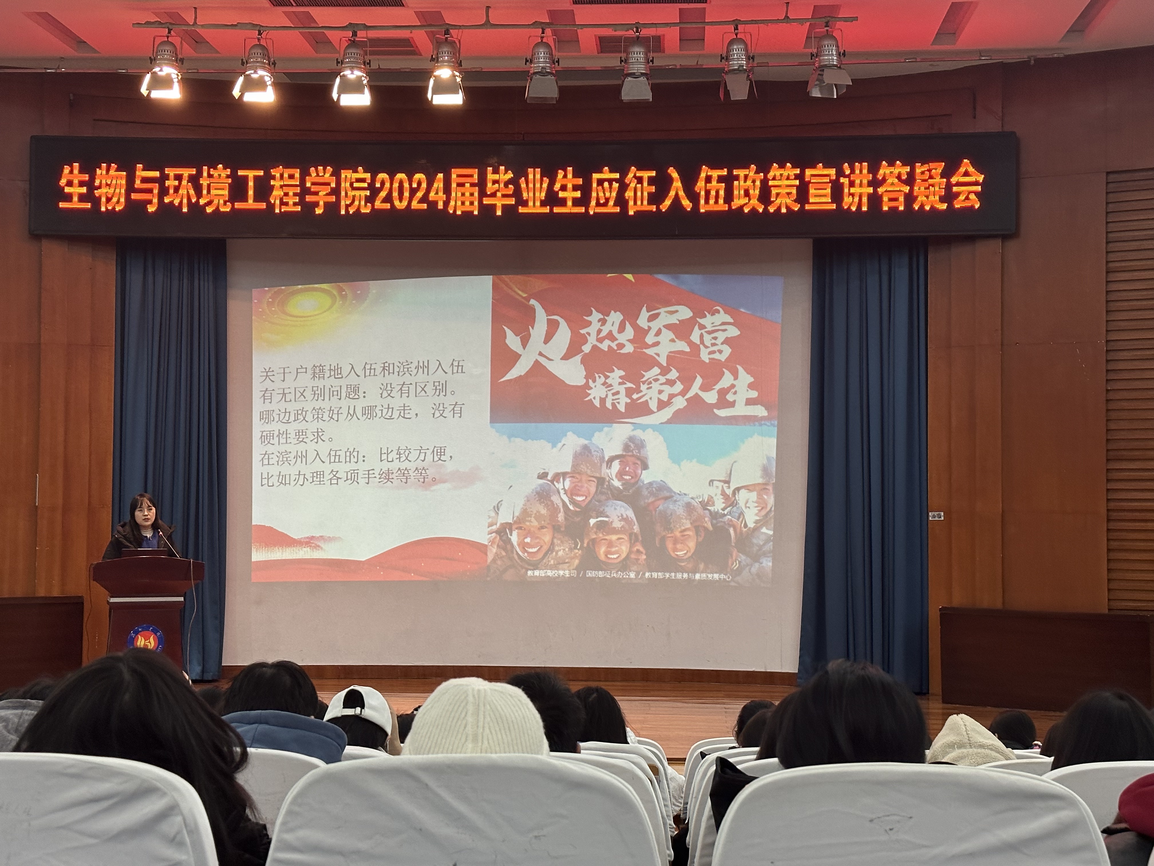 为激励大学生踊跃入伍,保家卫国,勇担使命,生物与环境工程学院在2023年12月25日14点30分于明德报告厅特此举办“2024届毕业生应征入伍政策宣讲答疑会”。