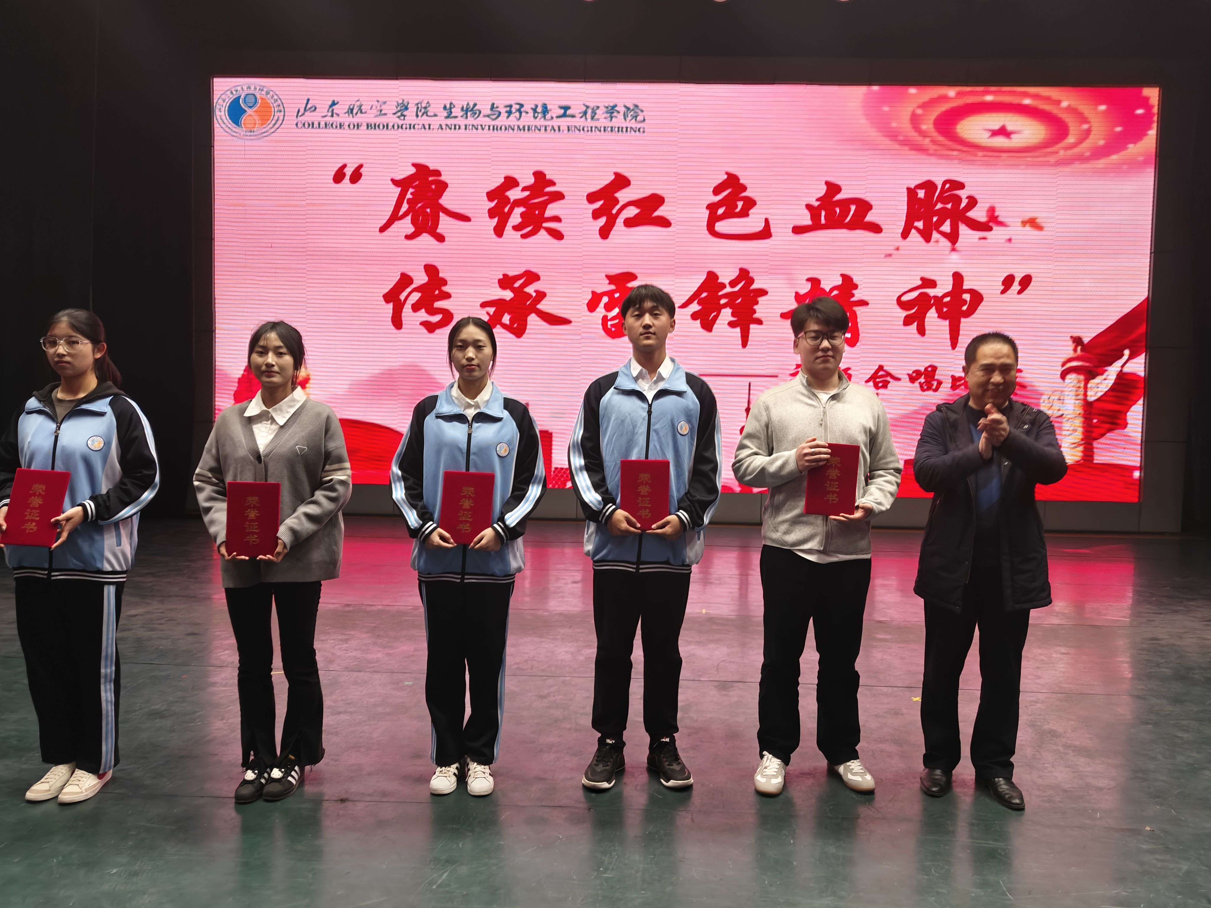 比赛开始,各个班级精心准备,以饱满的精神状态登台表演。每一个班级通过自己的演绎,展现了对雷锋精神的理解和传承。《学习雷锋好榜样》、《歌唱祖国》、《团结就是力量》等经典曲目,被赋予了新的时代内涵,激励着在场的每一个人。参赛班级的精心编排,以丰富的舞台表现力,将台下的同学带回那激情燃烧的岁月。每一位学生都用他们稚嫩而坚定的声音,诉说着对祖国的无限热爱和对英雄的敬畏之心。每一个音符都仿佛是一颗颗红色的火种,点燃了在场每一个人的爱国之心。随着最后一个节目演出结束,这场充满激情与感动的合唱比赛也画上圆满句号。比赛结束,生物与环境工程学院党总支书记李炳斋、党总支副书记时芸、辅导员满强分别为获得一等奖、二等奖、三等奖的班级颁奖。最后,全体2023级学生与评委老师们在学苑会堂门口进行了合照。