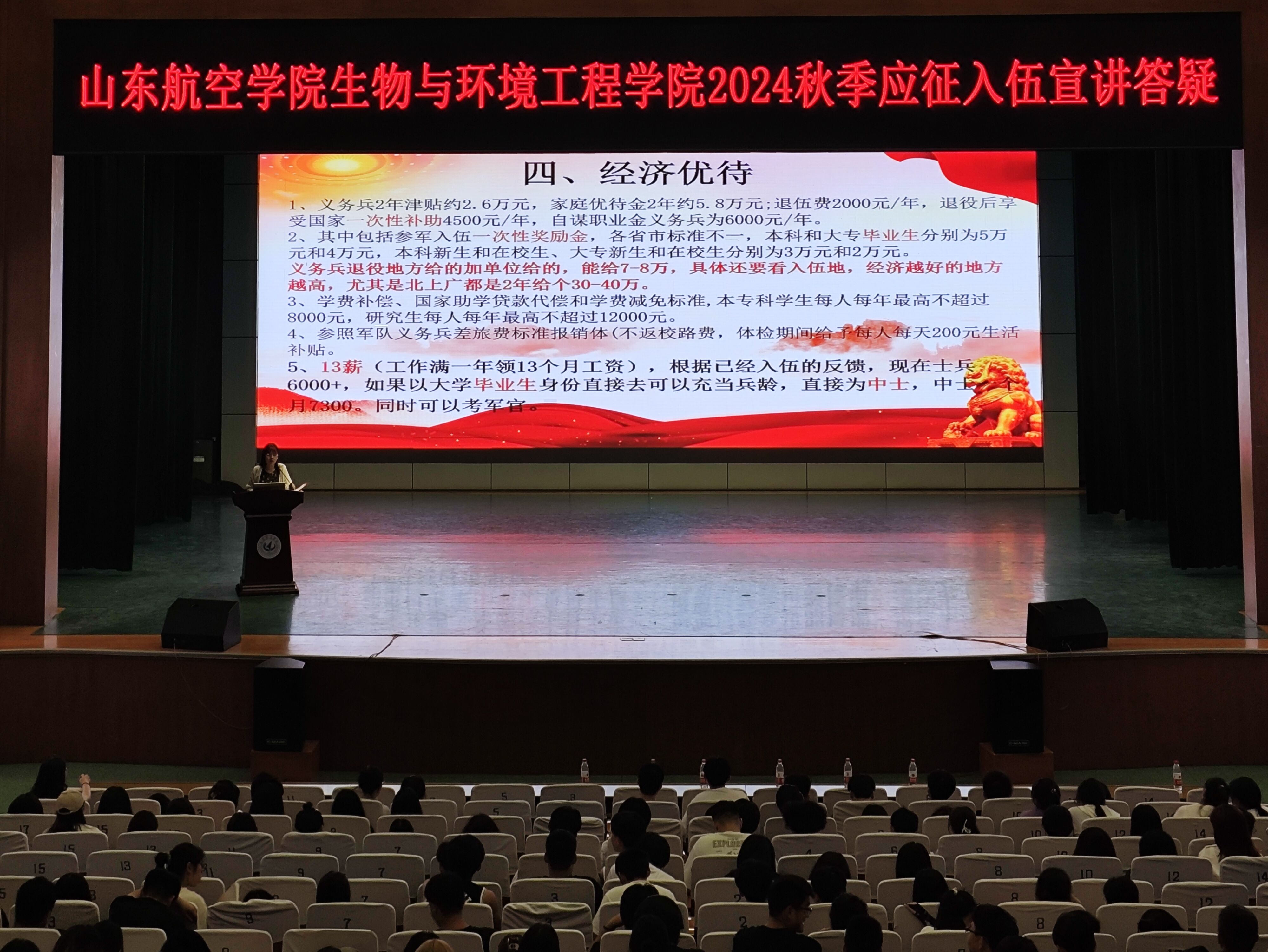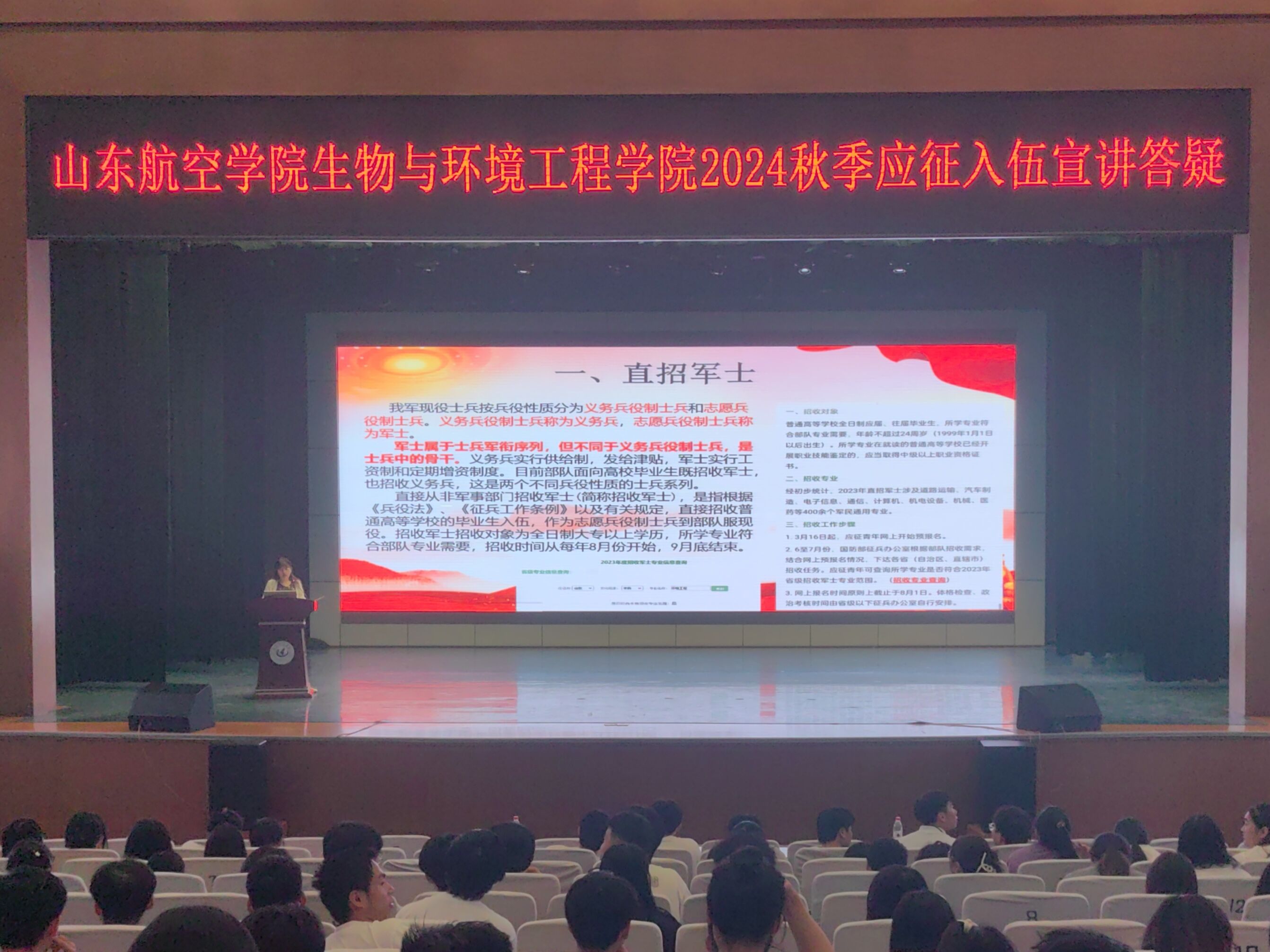 为使同学们进一步了解大学生应征入伍的相关优待政策,鼓励和引导大学生积极应征入伍,鼓励青年大学生积极投身国防建设,扎实做好秋季大学生征兵工作,激发学生报效祖国的热情。生物与环境工程学院于6月17日晚在学苑会堂召开秋季征兵入伍宣讲答疑。2024届部分毕业生以及在校生参与本次活动。