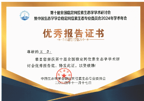 本次会议共进行103个口头报告和23个海报展示,并评选出13个优秀口头报告奖和5个优秀海报奖。我院刘京涛教授及资源与环境专业2024级研究生王卓参加会议。王卓做了题为《不同地下水水位条件下黄河三角洲湿地植物水分利用策略初探》的口头报告,并荣获第十届全国稳定同位素生态学学术研讨会优秀报告奖。