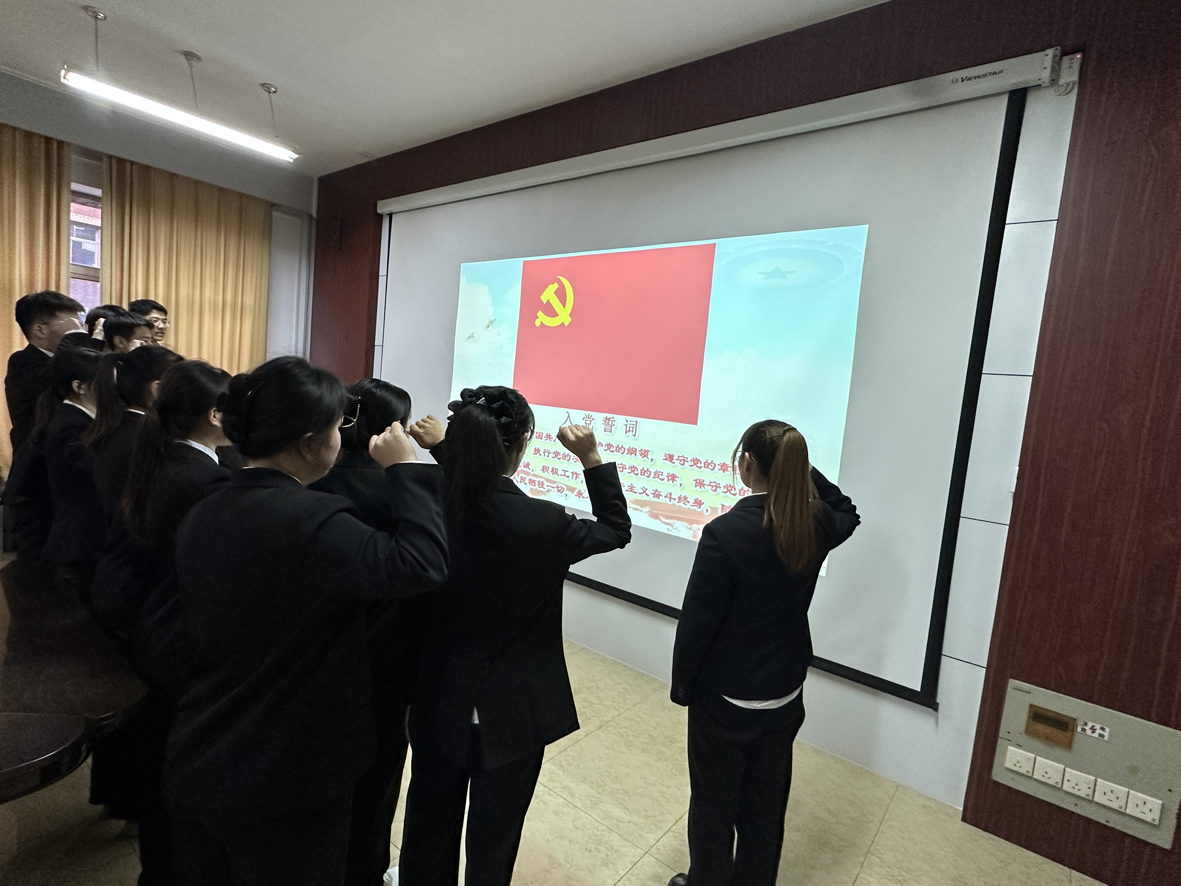 随后,集体宣誓环节,12名新党员整齐地排列成队,他们身姿挺拔,神情庄严肃穆。在领誓人的带领下,大家齐声高呼入党誓词,“我志愿加入中国共产党,拥护党的纲领,遵守党的章程……”那一句句誓词铿锵有力,掷地有声,在会议室里久久回荡,彰显着他们对党的忠诚、对共产主义事业的坚定信仰以及为人民服务的决心。