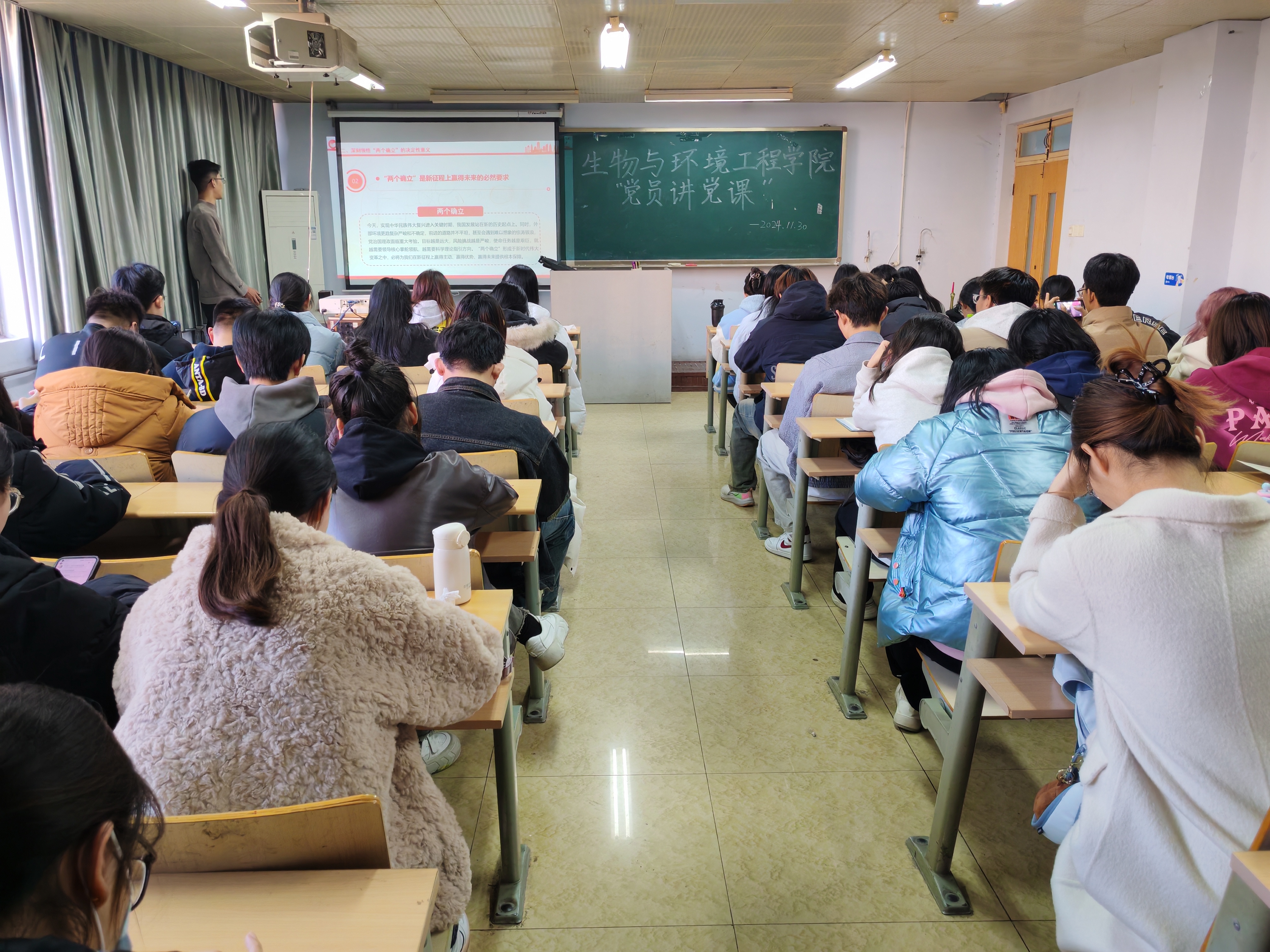 为了让同学们深入了解学习党的历史和思想方针,传承红色基因,铭记党的光辉历程,2024年11月30日下午,生物与环境工程学院党员讲党课活动在实验楼b7-311隆重召开,60余名班干以饱满的热情聆听党员讲述党的奋斗历程与党的思想。此次党课以“重走来时路,精神燃心烛”为主题,由预备党员宋吉明、李资滢宣讲,宋吉明主讲。