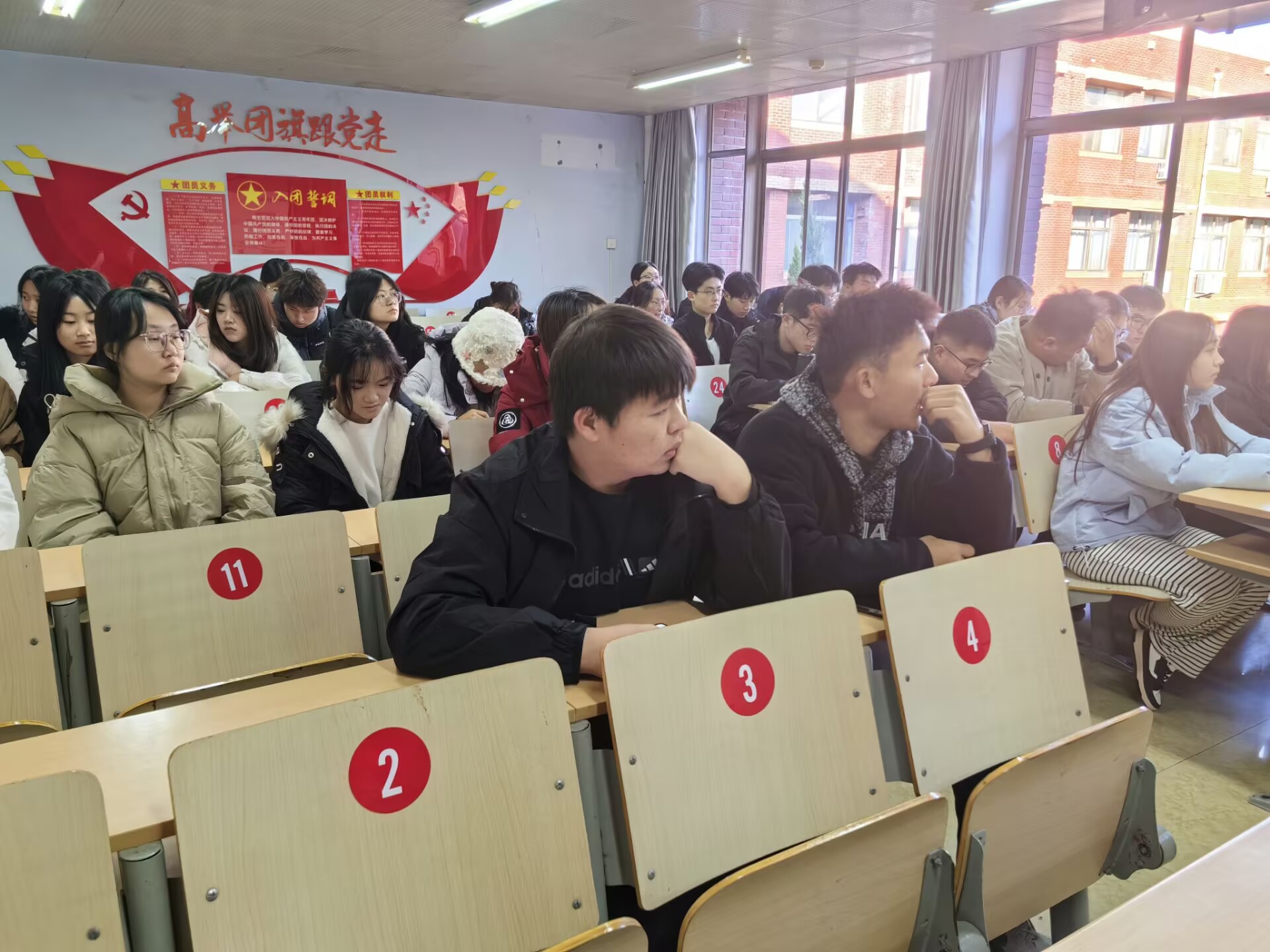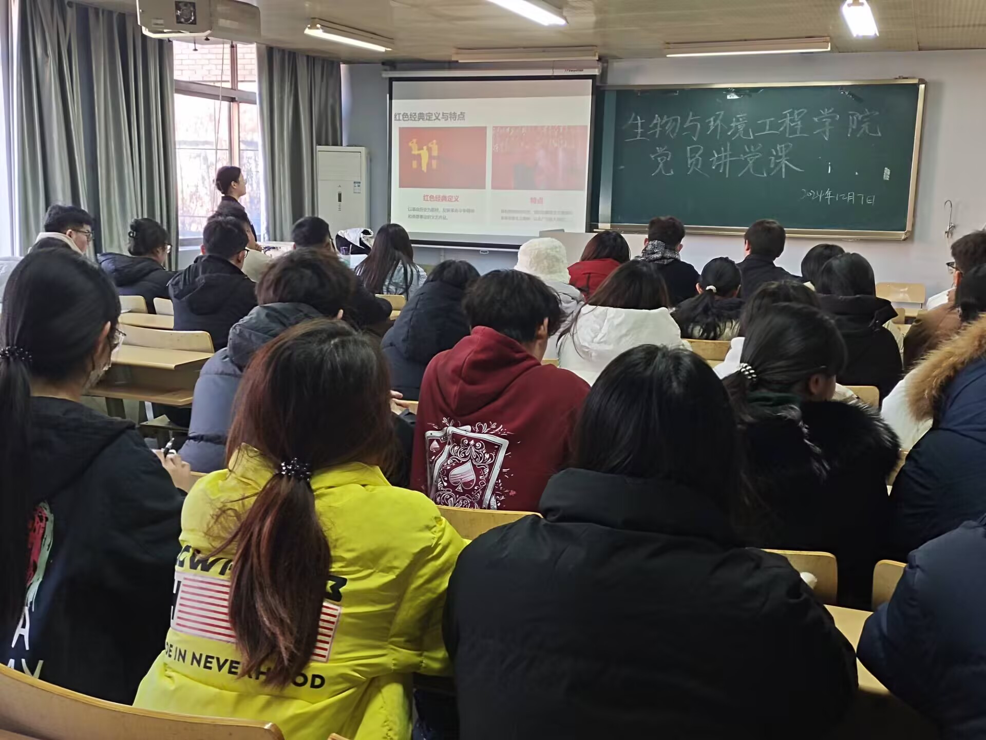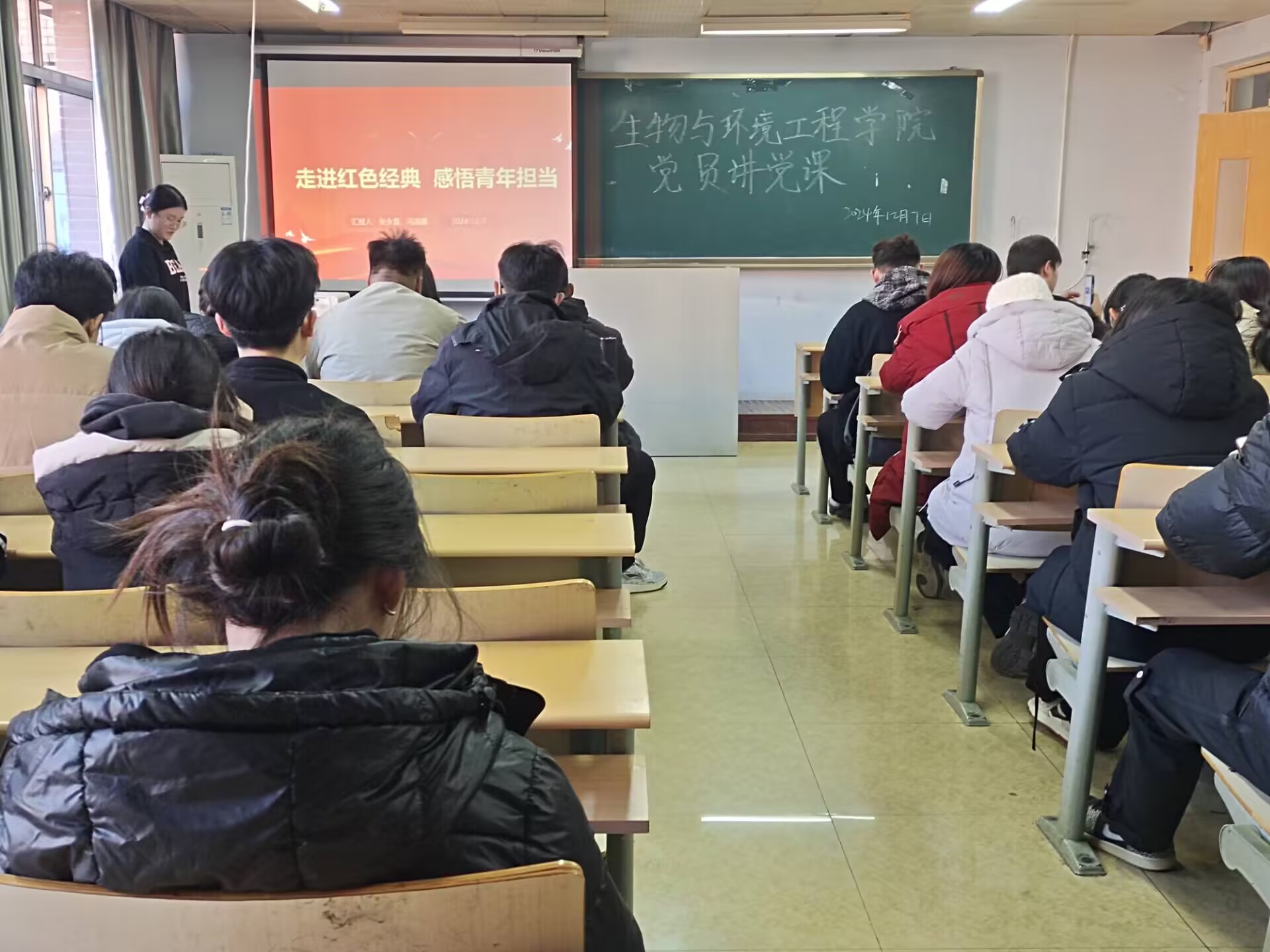 在深入学习贯彻习近平新时代中国特色社会主义思想与党的二十大精神的浪潮中,为切实提升党员思想政治素养,强化党员教育管理工作,生物与环境工程学院于12月7日在实验中心B7-311成功举办了党员讲党课活动。此次活动以“走进红色经典,感悟青年担当”为主题,由学院预备党员张永雪、冯淑英负责主持汇报,吸引了60余名班干踊跃参与。