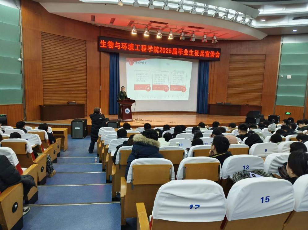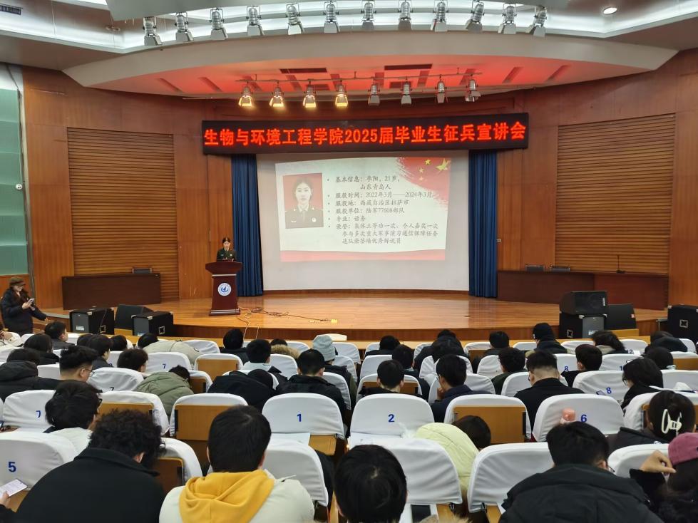 12月23日上午,生物与环境工程学院举办了一场面向毕业生的入伍宣讲会。此次宣讲会鼓励毕业生积极投身国防事业,为实现强国梦、强军梦贡献自己的力量。