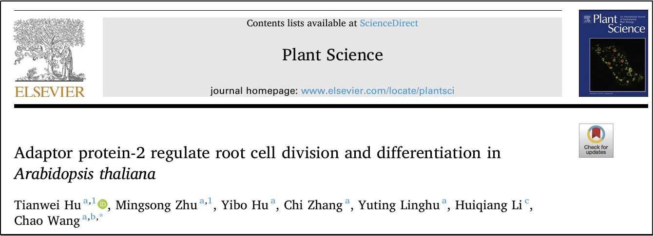 2025年5月18日,王超课题组在植物学老牌期刊《Plant Science》在线发表题为“Adaptor protein-2 regulate root cell division and differentiation in Arabidopsis thaliana”的研究论文,揭示了网格蛋白接头复合体AP-2 (Adaptor protein-2)在植物根尖细胞分裂和分化中的生物学功能。