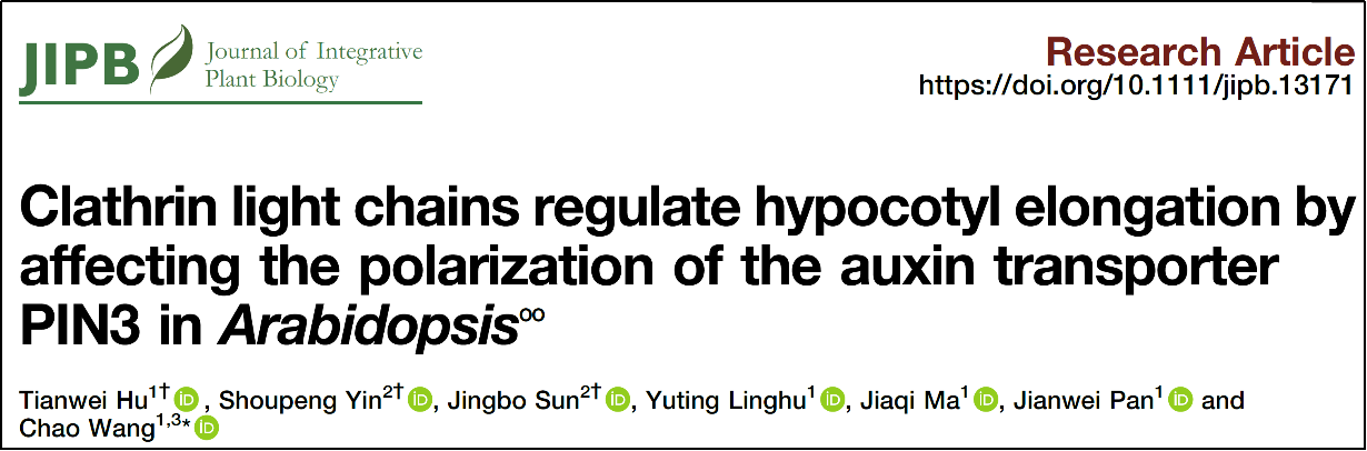 2021年9月,王超课题组在植物学领域著名期刊《Journal of Integrative Plant Biology》上发表题为“Clathrin light chains regulate hypocotyl elongation by affecting the polarization of the auxin transporter PIN3 in Arabidopsis”的研究论文,揭示了网格蛋白轻链调控植物下胚轴伸长的分子机制。