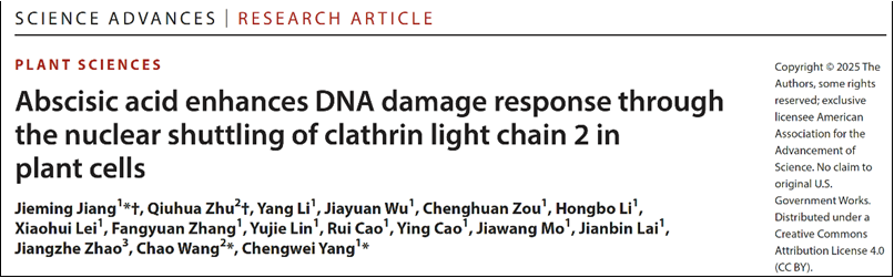2025年6月,我院优秀校友王超教授课题组与华南师范大学合作在《Science Advances》在线发表题为“Abscisic acid enhances DNA damage response through the nuclear shuttling of clathrin light chain 2 in plant cells”的研究论文,揭示了网格蛋白轻链CLC2参与调控植物DNA损伤响应的分子机制。网格蛋白介导的内吞(CME)是真核细胞最重要的内吞途径之一,在细胞生命活动过程中具有关键性调控功能。我院2018级校友朱秋华是本论文的共同第一作者。