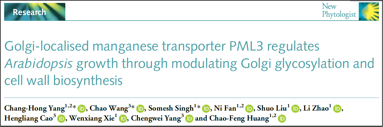 2021年9月,王超课题组与分子植物科学卓越创新中心在植物学领域权威期刊《New Phytologist》上发表题为“Golgi-localised manganese transporter PML3 regulates Arabidopsis growth through modulating Golgi glycosylation and cell wall biosynthesis”的研究论文,揭示了高尔基体锰转运体PML3在高尔基体糖基化和细胞壁合成中的生物学功能。