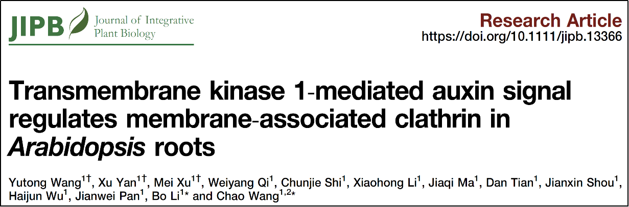 2023年1月,王超课题组在植物学领域著名期刊《Journal of Integrative Plant Biology》在线发表题为“Tran**embrane kinase 1-mediated auxin signal regulates membrane-associated clathrin in Arabidopsis roots”的研究论文,揭示了生长素调控网格蛋白的质膜招募依赖于类受体激酶TMK1。