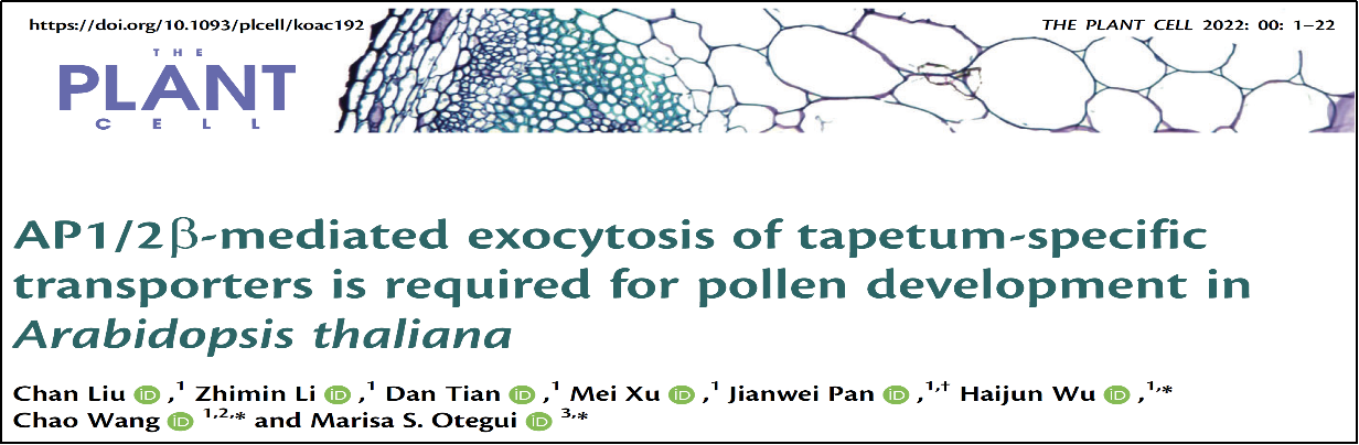 2022年6月,王超课题组与美国威斯康星大学合作在植物学领域顶级期刊《Plant Cell》在线发表题为“AP1/2β-mediated exocytosis of tapetum-specific transporters is required for pollen development in Arabidopsis thaliana”的研究论文,揭示了网格蛋白接头蛋白复合体AP-1的β亚基调控植物花粉发育的分子机制。