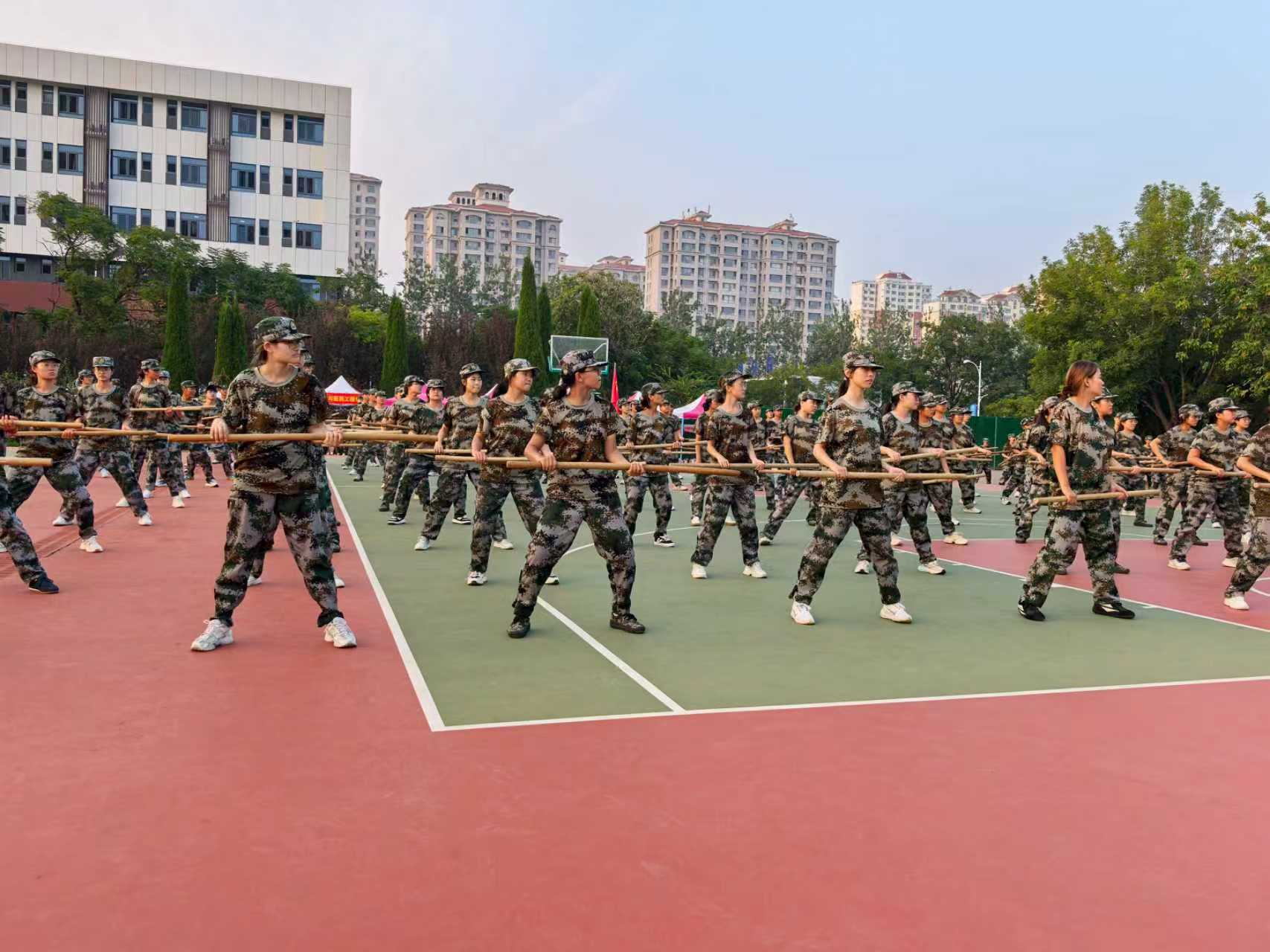 白天的训练场是真正的“战场”。反复打磨的队列动作,从精益求精的摆臂高度到分毫不差的步幅间距,见证着我们持之以恒的努力。站军姿时,任凭汗水浸透衣衫、阳光灼热皮肤,同学们依旧目不斜视、稳如泰山,展现出坚韧不拔的顽强意志。每一次踢正步,腿麻了也要坚定不移地定在空中;每一次喊口号,嗓子哑了也要声如洪钟地吼出气势。这是一种“百炼成钢”的必胜信念。我们深知,唯有经历千锤百炼,方能成就刚毅挺拔的军人风范。