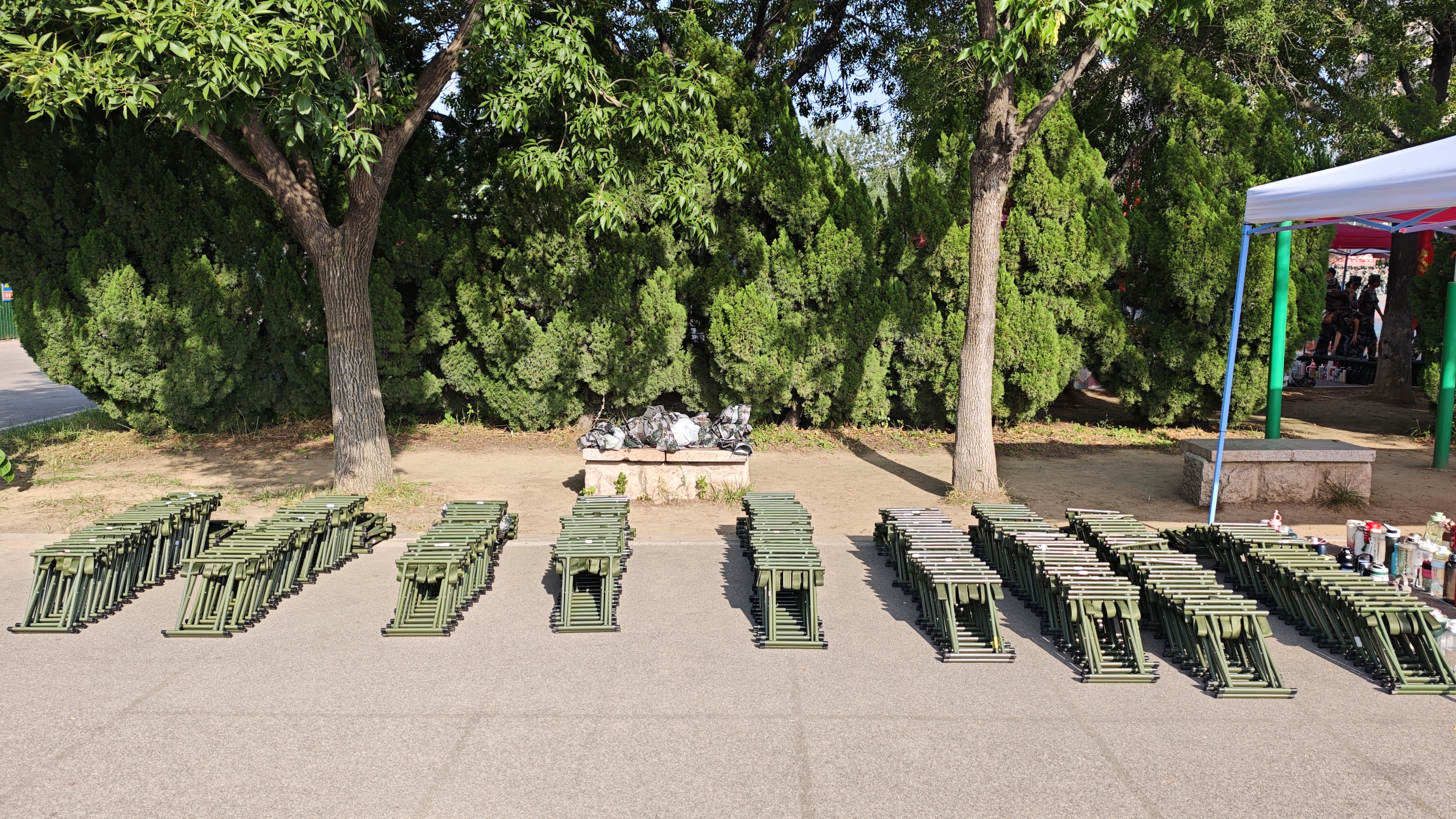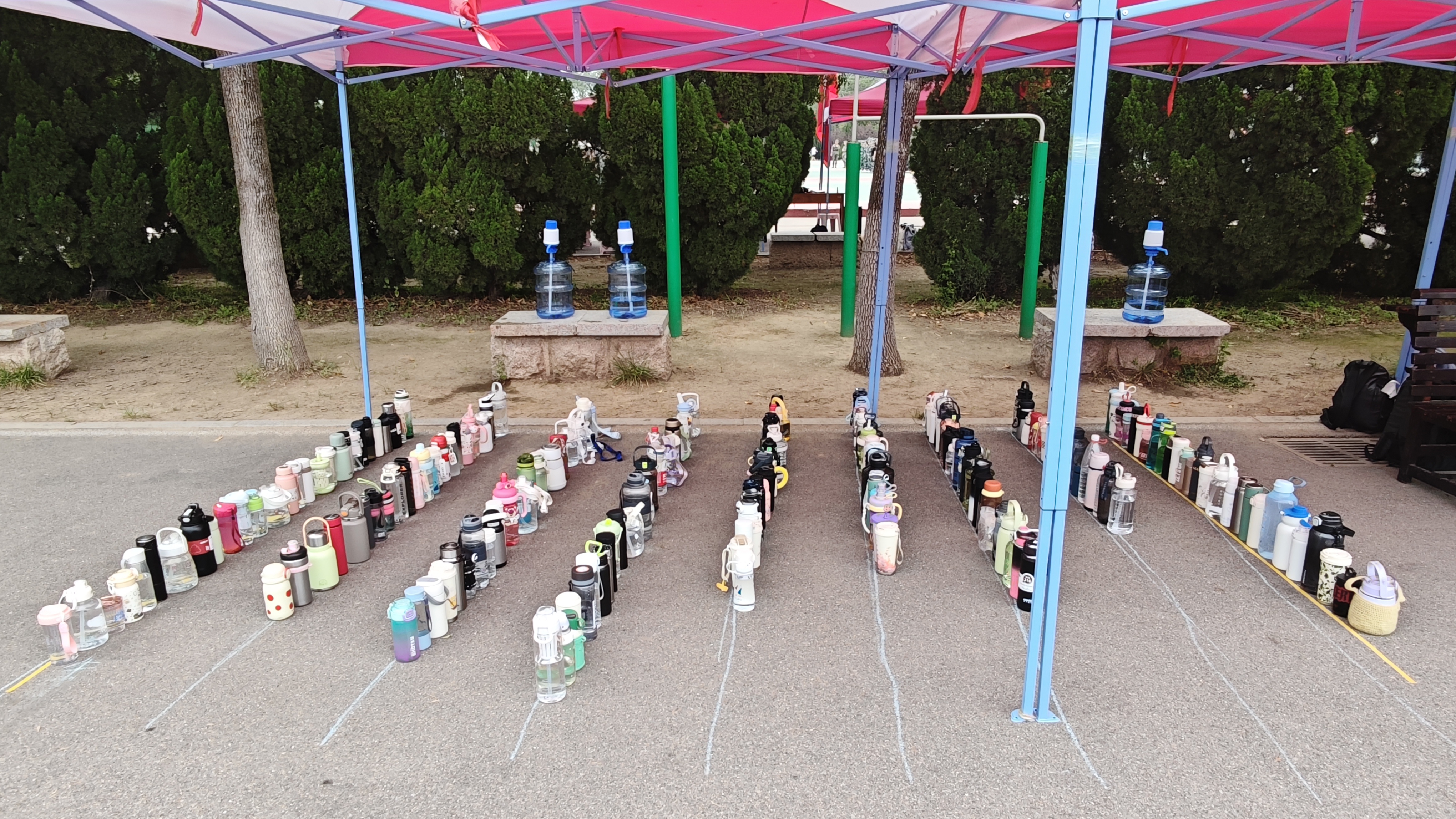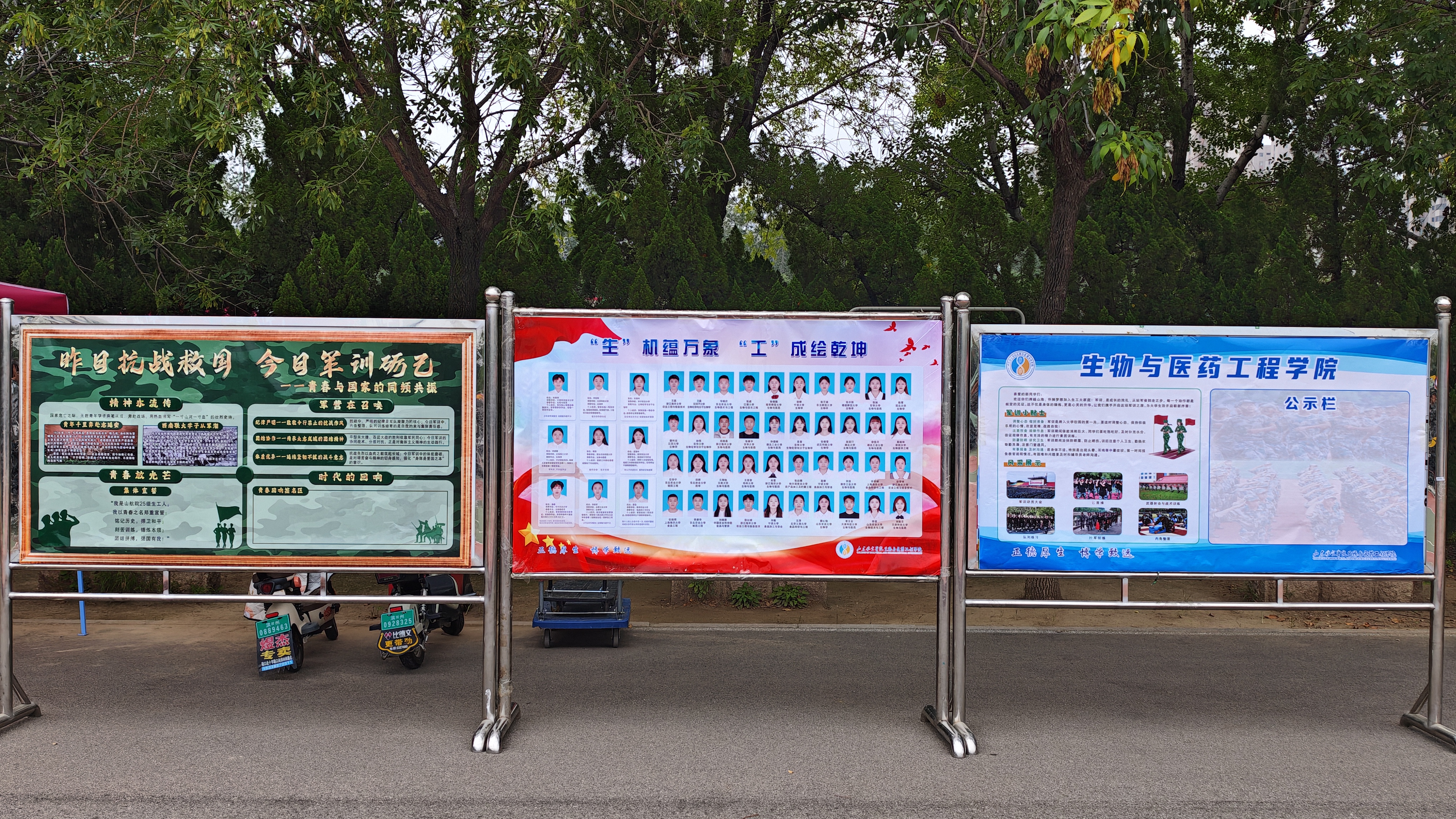 看!从握拳的角度到摆臂的高度,从站立的重心到转身的节奏,每一个细节都凝聚着生工人独有的专注。当教官纠正队列间距时,无人抱怨反复练习的艰辛;当汗水浸透训练迷彩服时,无人擅自擦拭满身的汗渍。这份对纪律的敬畏,正是生工人“作风端正,纪律严明”的生动注脚。那摆放笔直成线的水壶、鳞次栉比的马扎,主动按序排队打水的自律,都是生工人的最美瞬间;集合哨声嘹亮响起,学子们迅速在规定时间内列队完毕,没有多余的动作,没有懈怠的神情,因为他们每个人都深知,军训中的“精准把控”,恰如未来在生物实验室里调试仪器、配比试剂、汇算数据的严谨细致——差之毫厘,谬以千里。
