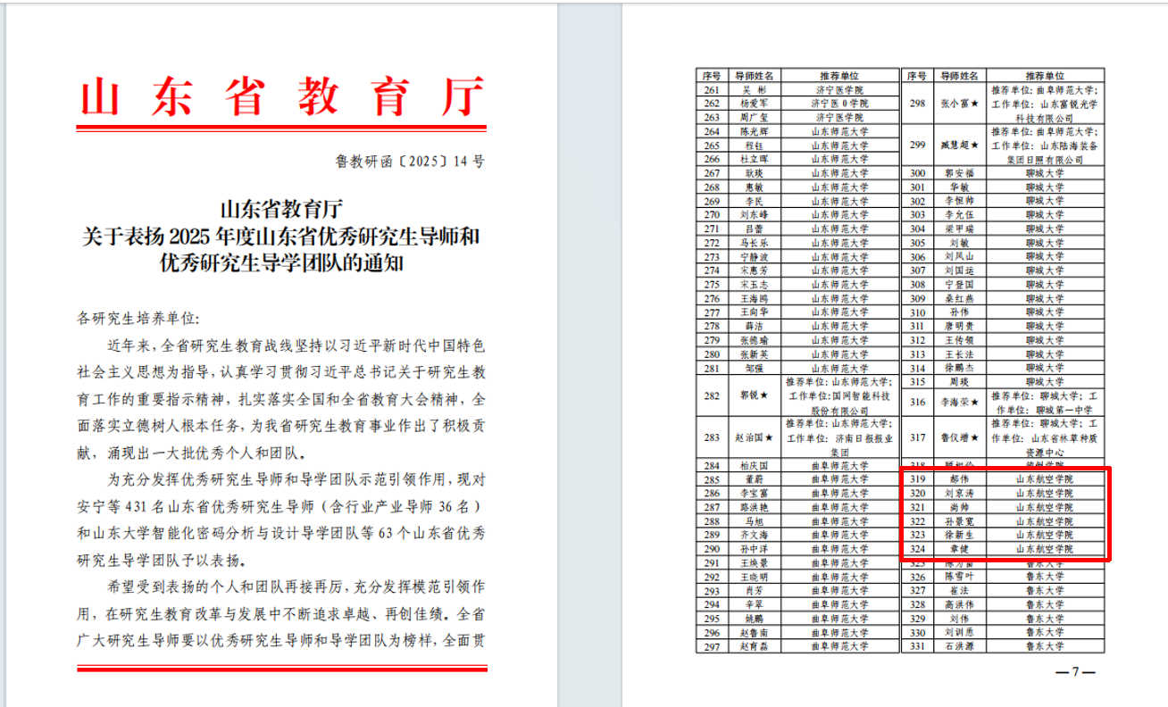 近日,山东省教育厅发布2025年英国365领域表彰名单。我校在本次评选中成绩斐然,共有6名教师荣获“山东省优秀研究生导师”称号、1个团队荣获“山东省优秀研究生导学团队”荣誉称号,受到表彰奖励的总量创历史新高。