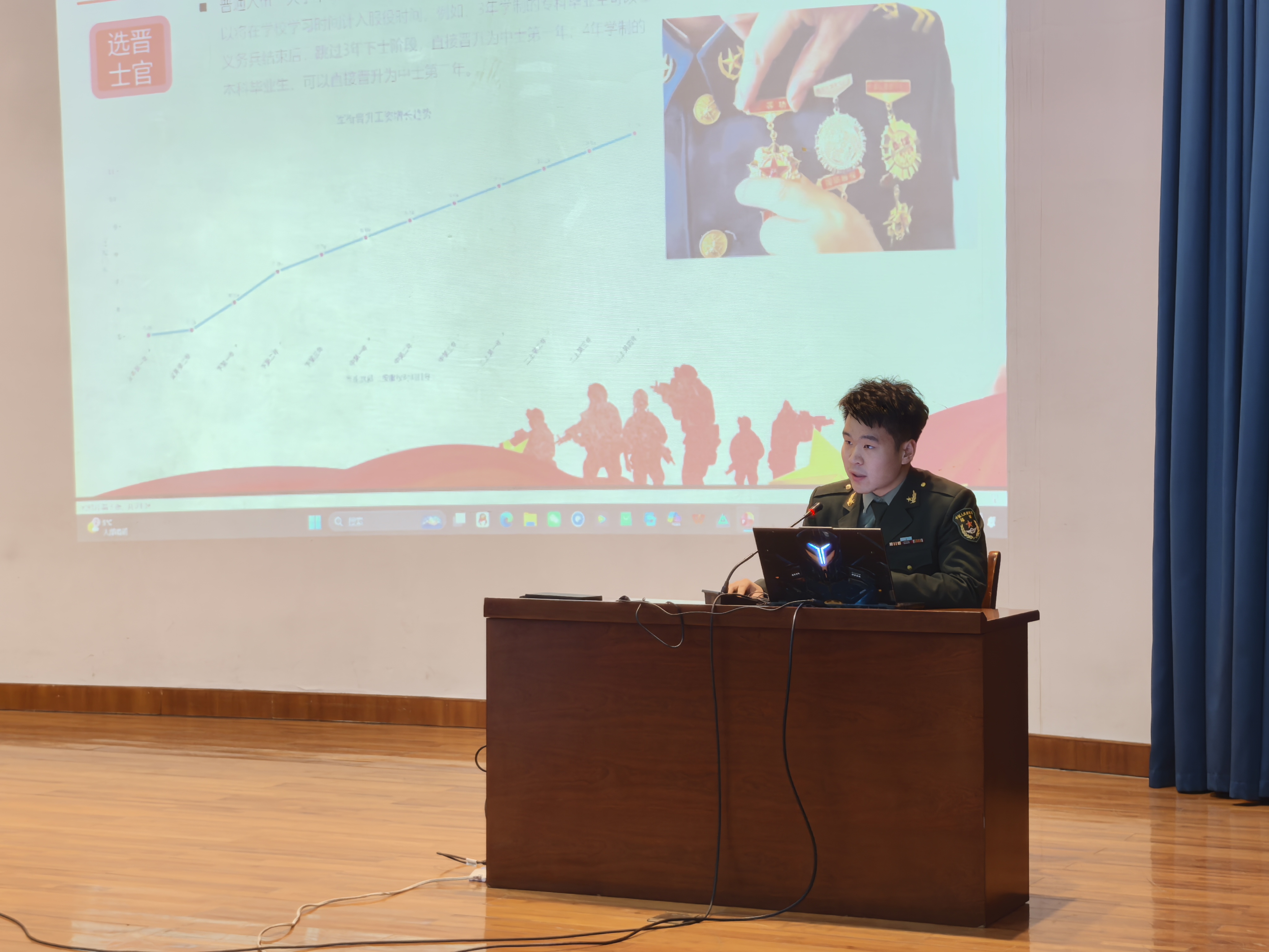 会议伊始,范开浩结合自身服役经历,围绕部队发展路径、待遇保障以及入伍流程等方面展开了详细解读。他着重分析了大学毕业生入伍的两条核心发展途径:提干与选晋士官,并对比了两条路径的职业前景与晋升优势。针对提干政策,他强调本科毕业生在26岁前参加提干考试的成功率可达30%,且备考期间单位会提供专项支持;同时,军官的薪资待遇优于相应地市公务员,退役后还能获得编制优先安置的机会。随后,他系统地梳理了义务兵优待金、住房保障、军属福利以及退役优待政策,其中涵盖学费补偿、考研加分、免费技能培训等实实在在的支持。最后,他通过展示部队参与“降魔净土 - 2023”化武处置、黑龙江洪灾救援以及马里维和任务等案例,生动地诠释了军人的责任与荣光,并鼓励同学们把握青春机遇,将个人理想融入强军事业。