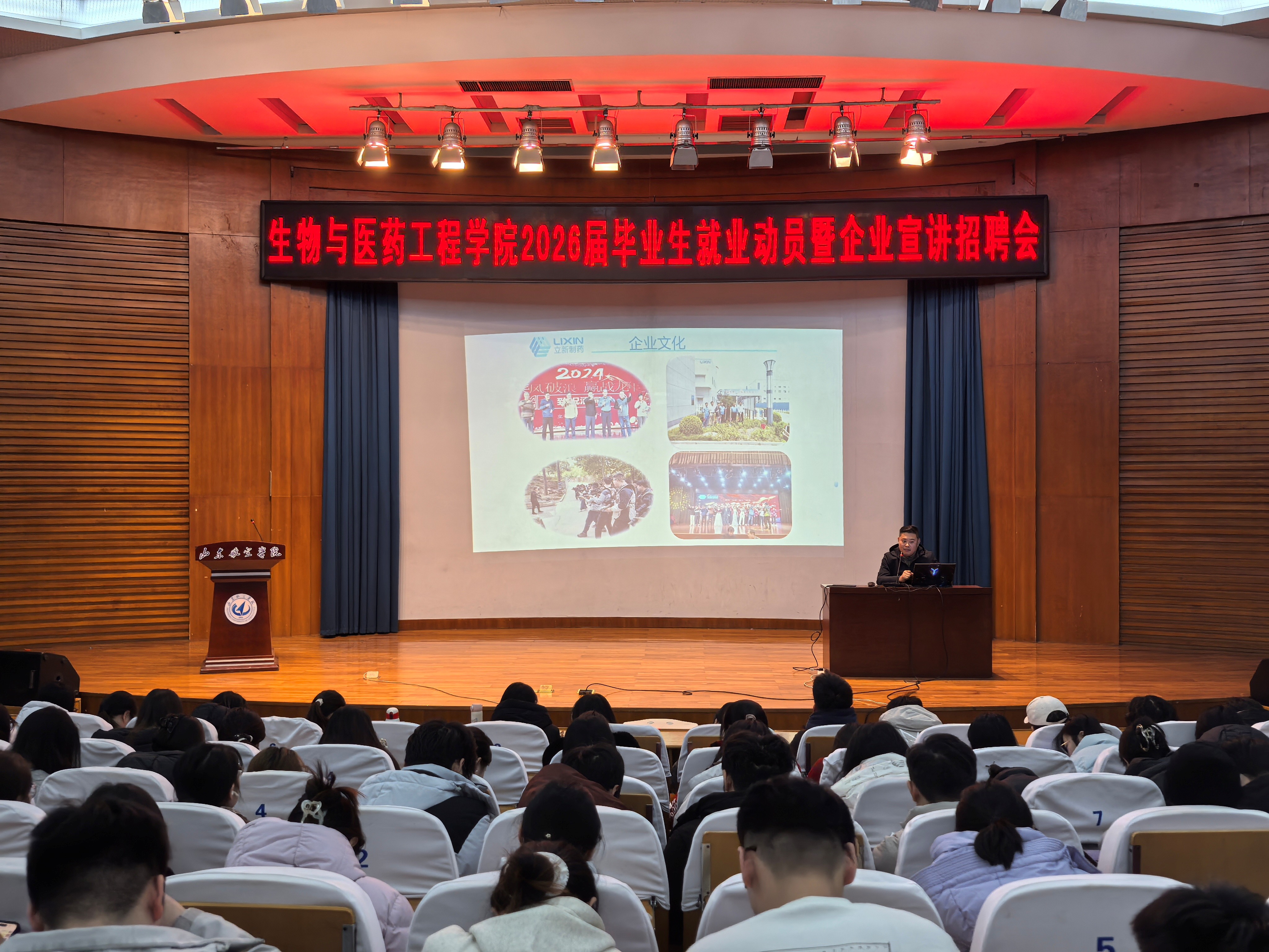 产业学会石领先老师围绕低空经济发展趋势与人才需求分享。他指出,当前低空经济发展迅速,无人机应用广泛,市场对专业人才需求大,但产业人才缺口明显。他鼓励毕业生积极参与,让无人机驾驶技能成为职业“加分项”。企业宣讲环节,各行业标杆企业带来诸多岗位与机遇。立新制药聚焦原料药及中间体,推出质量管控、实验师等岗位,强调质量体系与绿色合成工艺优势;鲁南制药作为大型药企,推出医学专员等特色岗位,可观的年收入吸引了一众学子;健源食品则推出食品研发工程师等岗位,详细介绍了薪资调整、晋升通道等福利。