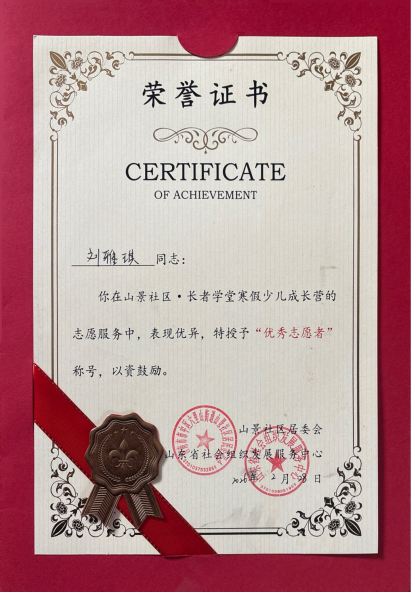 结业仪式上,“优秀志愿者”证书是对我的肯定,更是前行的动力。这次实践让我走出校园,在服务中锤炼沟通协调能力,深刻理解“青鸟归巢”的意义——返乡不仅是重温故土,更是用青春反哺家乡。未来,我将带着这份担当,努力学习专业知识,让青春在奉献社会中绽放光彩。